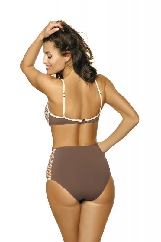 Plavky sú vyrobené z hladkej látky a ažúrovej sieťoviny. Podprsenka má vytvarované košíčky. Medzi košíčkami je pekné nariasenie. Ramienka je možné nastaviť, ale nemožno ich odopnúť. Podprsenka sa vzadu zapína pohodlným klipom. Nohavičky majú vyšší strih.