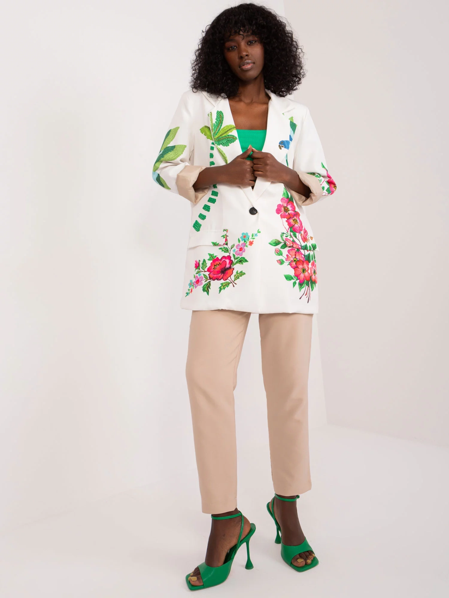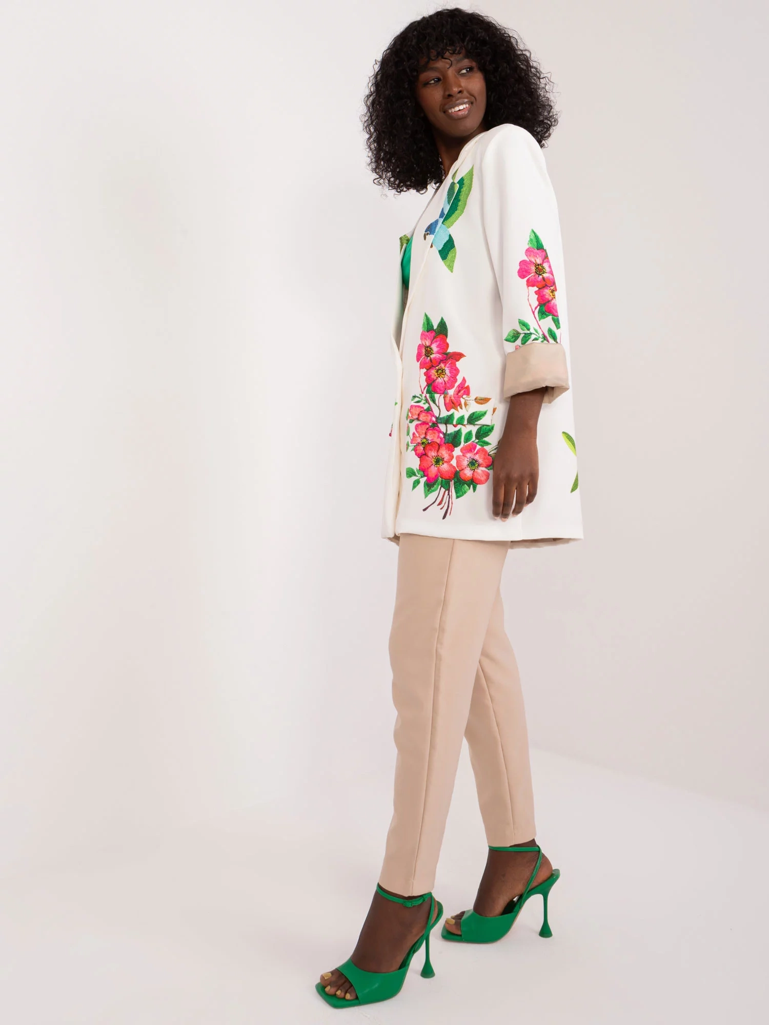 Modelka má na sebe jednu veľkosť. Rozmery modelky: výška 168 cm, prsia 82 cm, pás 62 cm, boky 93 cm.