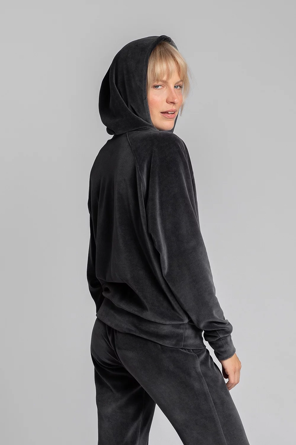 Velúrová mikina nadmernej veľkosti s predĺženými netopierími rukávmi s manžetami, klokaním vreckom, kapucňou a ozdobnou výšivkou vlka na hrudi. Úplná nevyhnutnosť na nosenie doma alebo keď potrebujete niečo teplé na jesenný výlet.