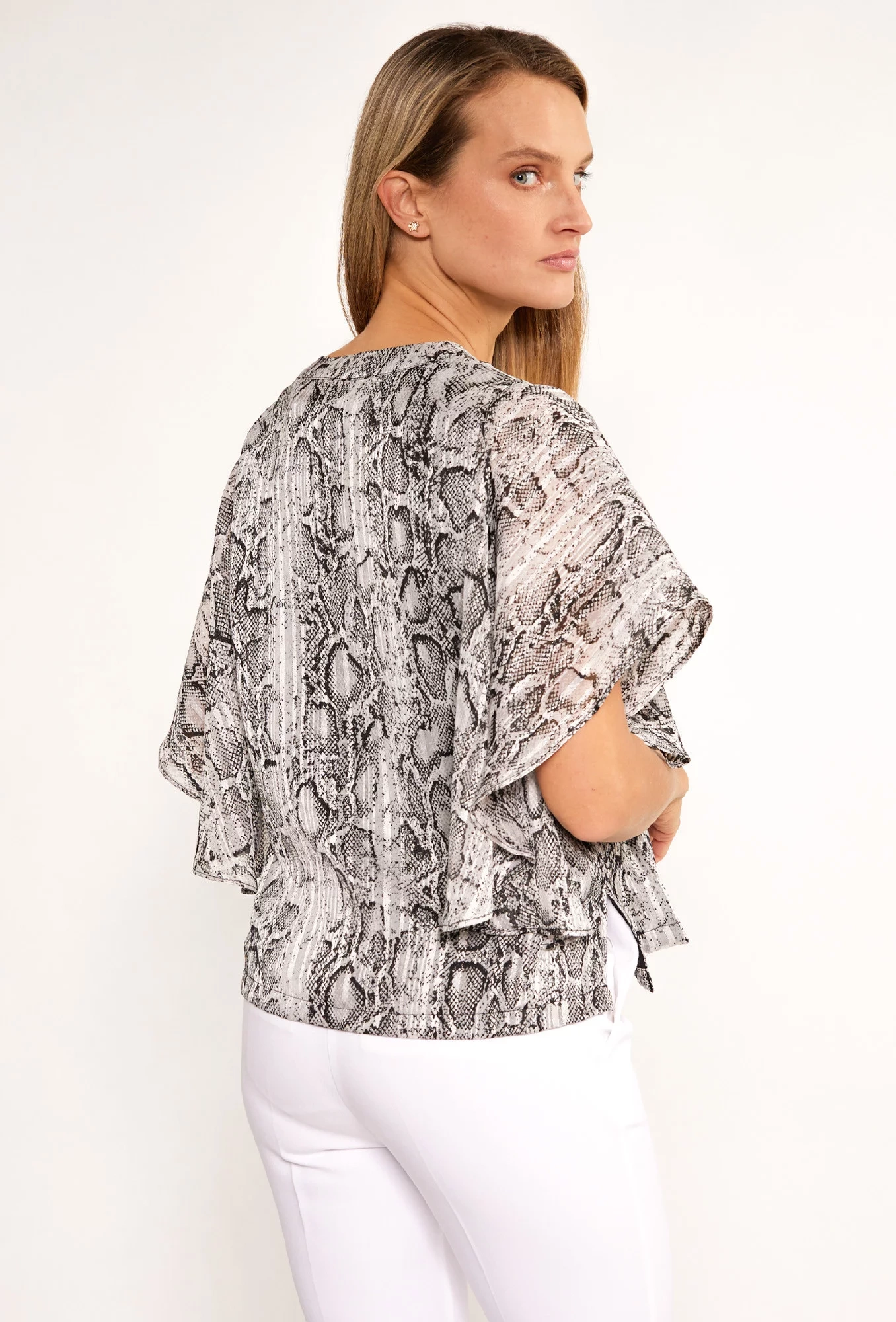 Vzorovaná dámska blúzka s volánikom na rukávoch. Blúzka s výstrihom do V. Tento model sa skvele hodí ako doplnok ku každodenným štylizáciám a ďalším veciam. Modelka na obrázku je 177 cm vysoká a má veľkosť 36.