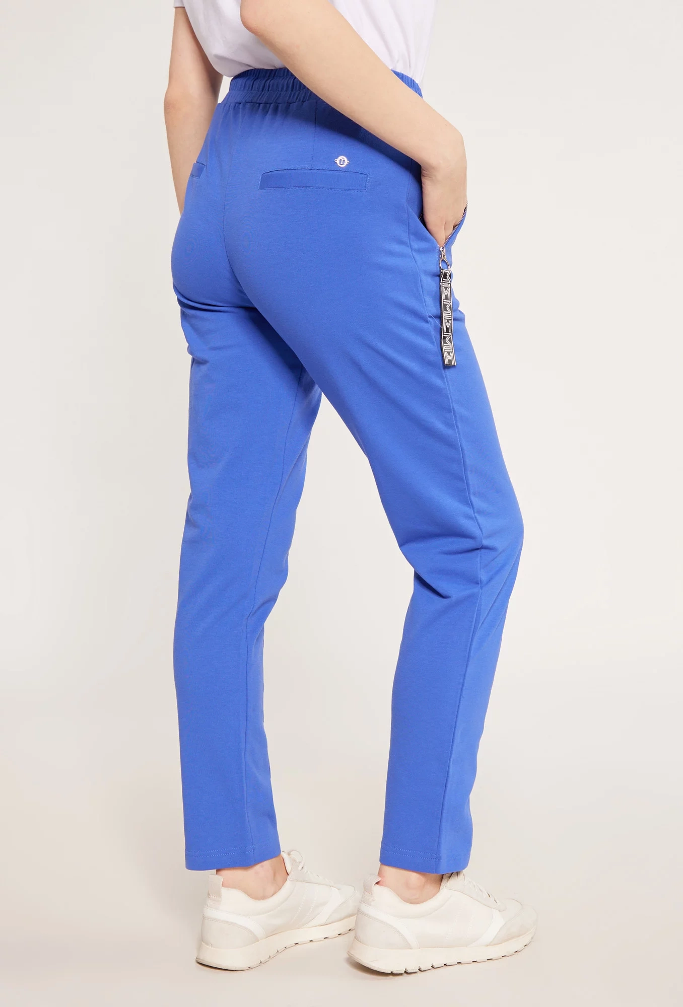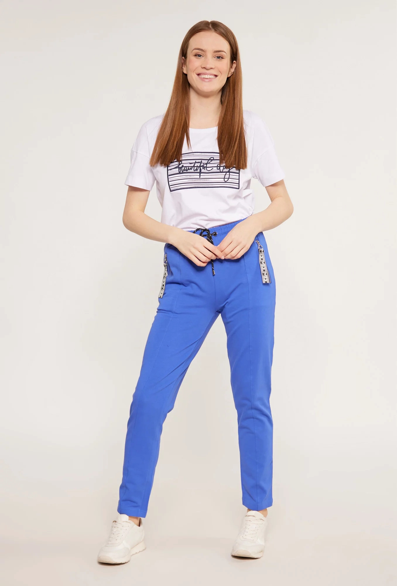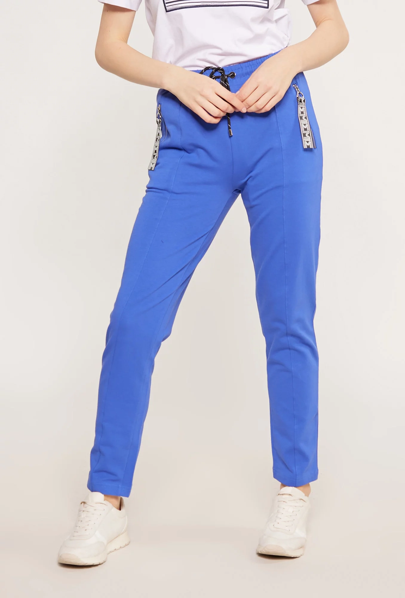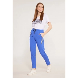 Dámske tepláky s aplikáciou so zapínanými vreckami na bokoch. Nohavice s dlhými rovnými nohavicami. V páse sú nohavice opatrené gumou so zaväzovaním. Tento model skvele doplní každodennú jarnú štylizáciu. Odporúčame tiež zvoliť zodpovedajúcu mikinu z rovnakého radu. Modelka na obrázku je 177 cm vysoká a má veľkosť 36.