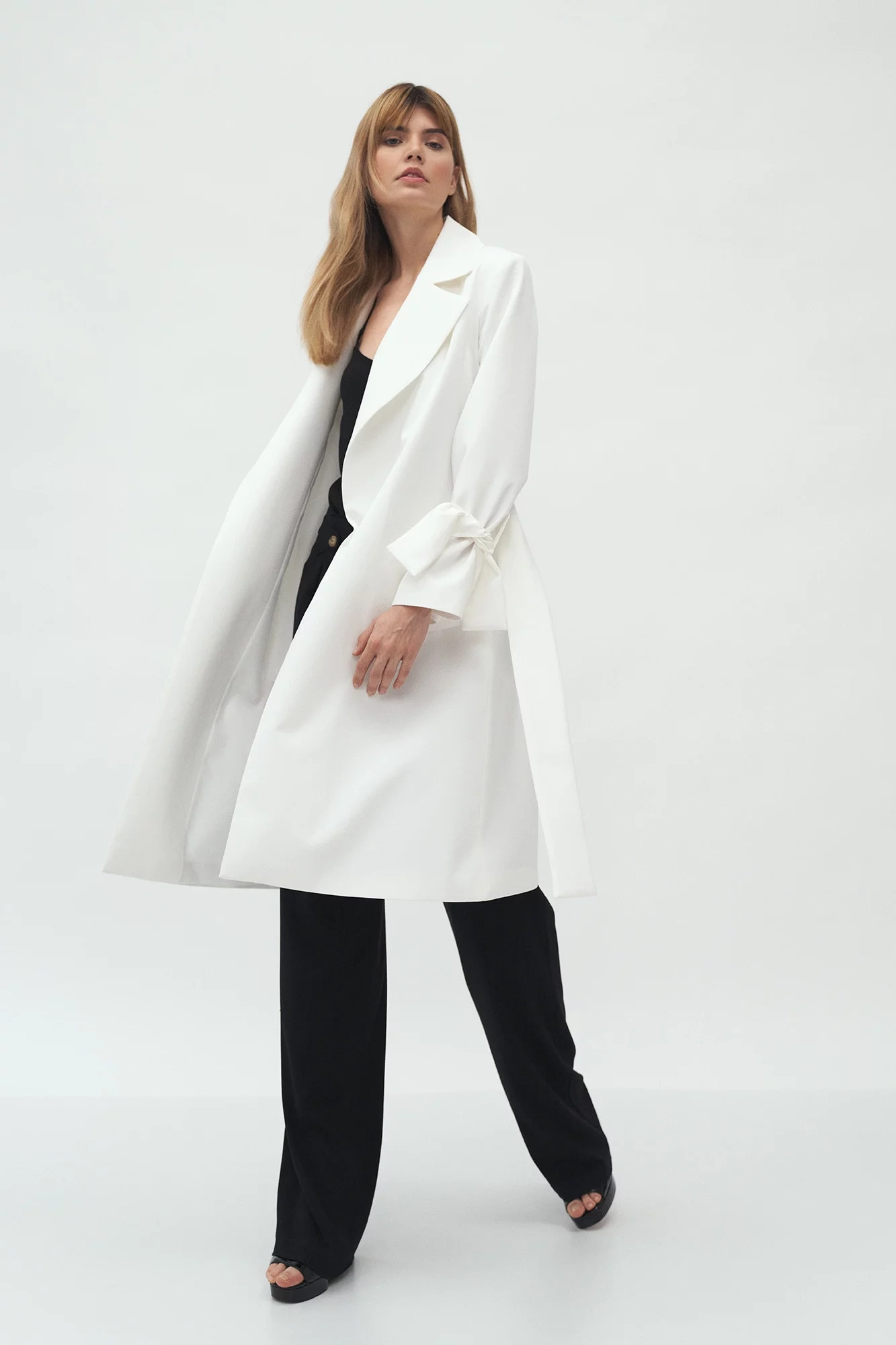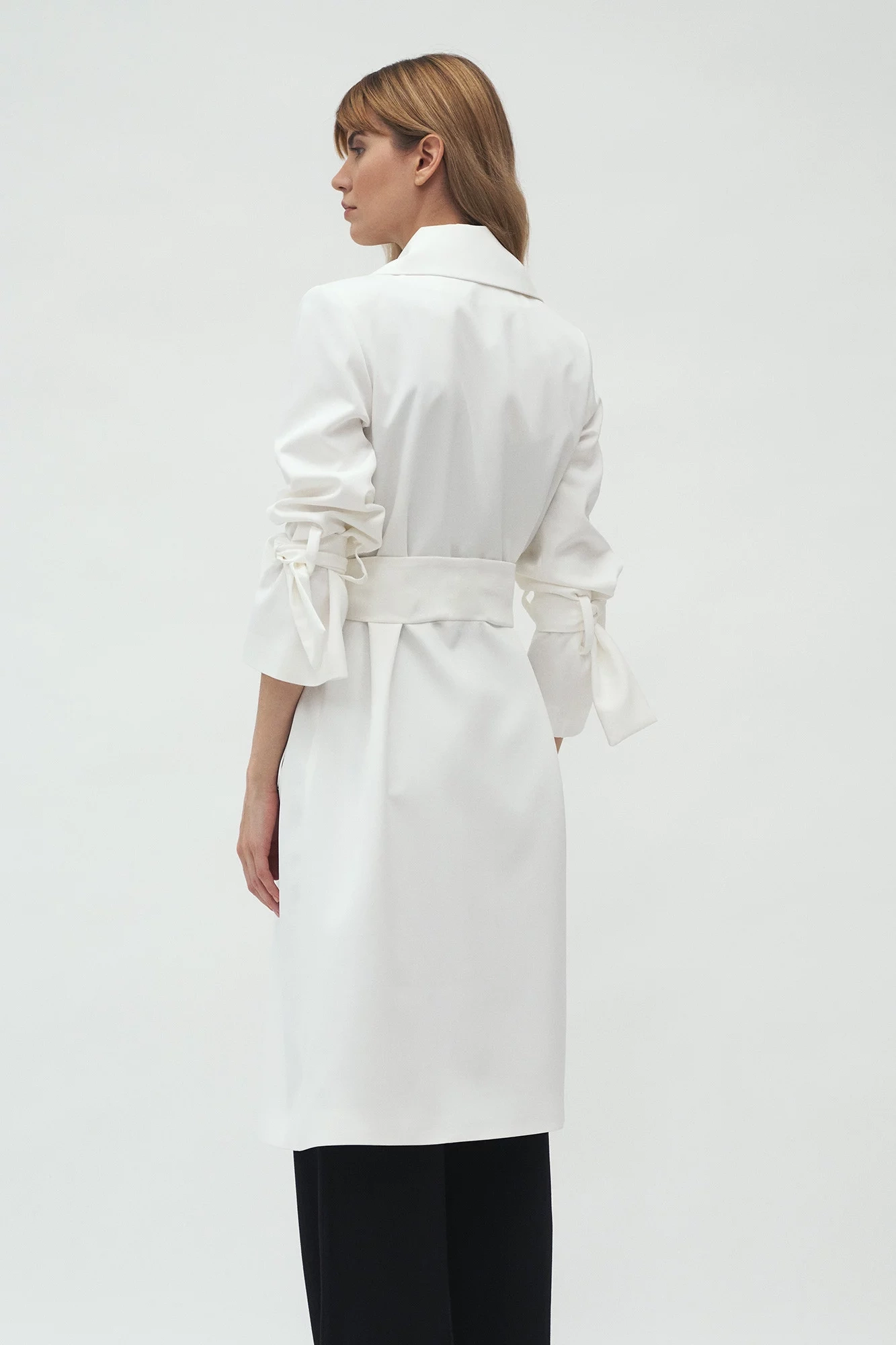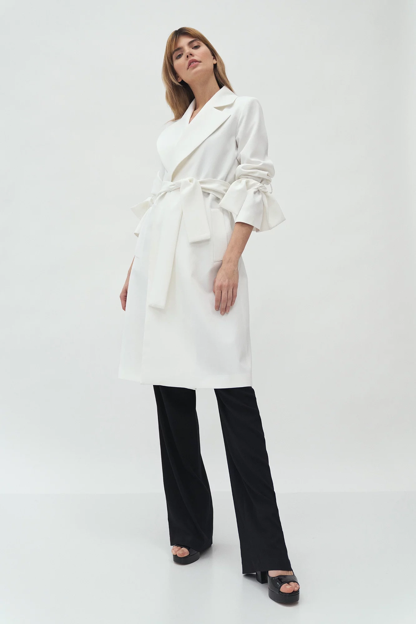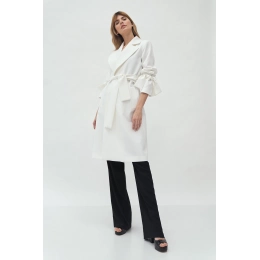 Kabát s dĺžkou ku kolenám, pásikom na zaviazanie v páse, širokými chlopňami a prednými vreckami. Pásky na zaväzovanie v manžetách umožňujú upraviť dĺžku rukávov.100% polyester Farba: ecru Kolekcia: Jar/Jeseň Pohlavie: Ženské
