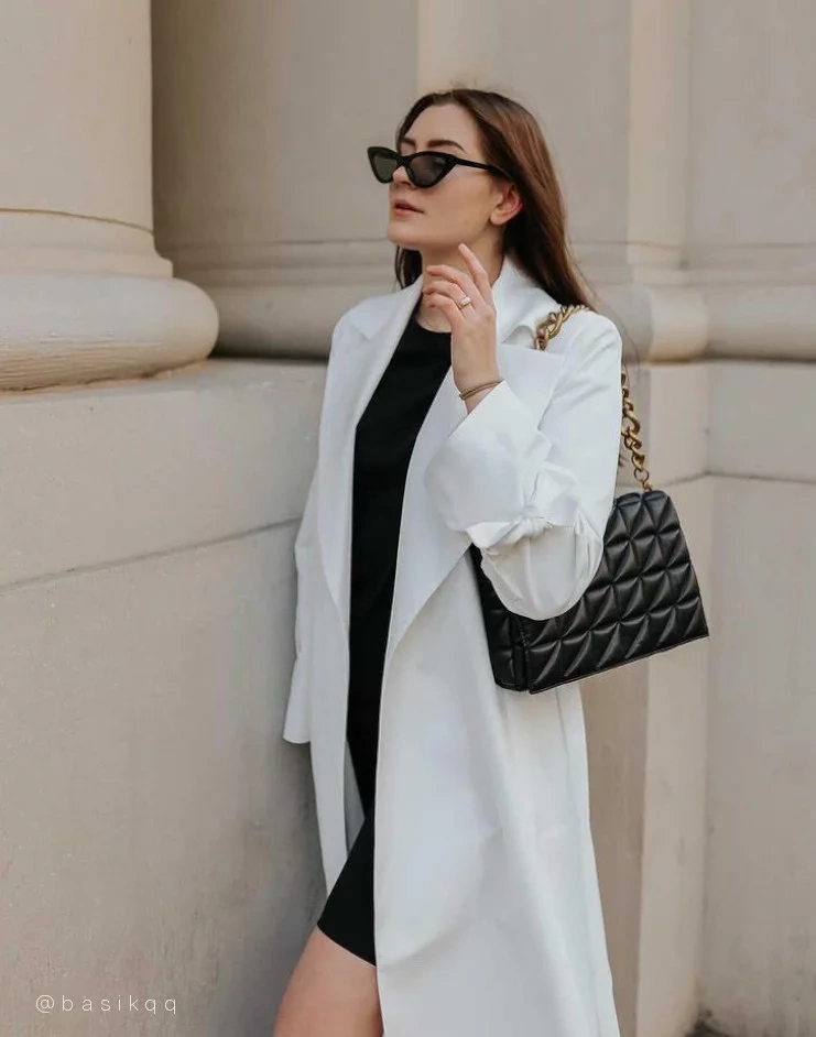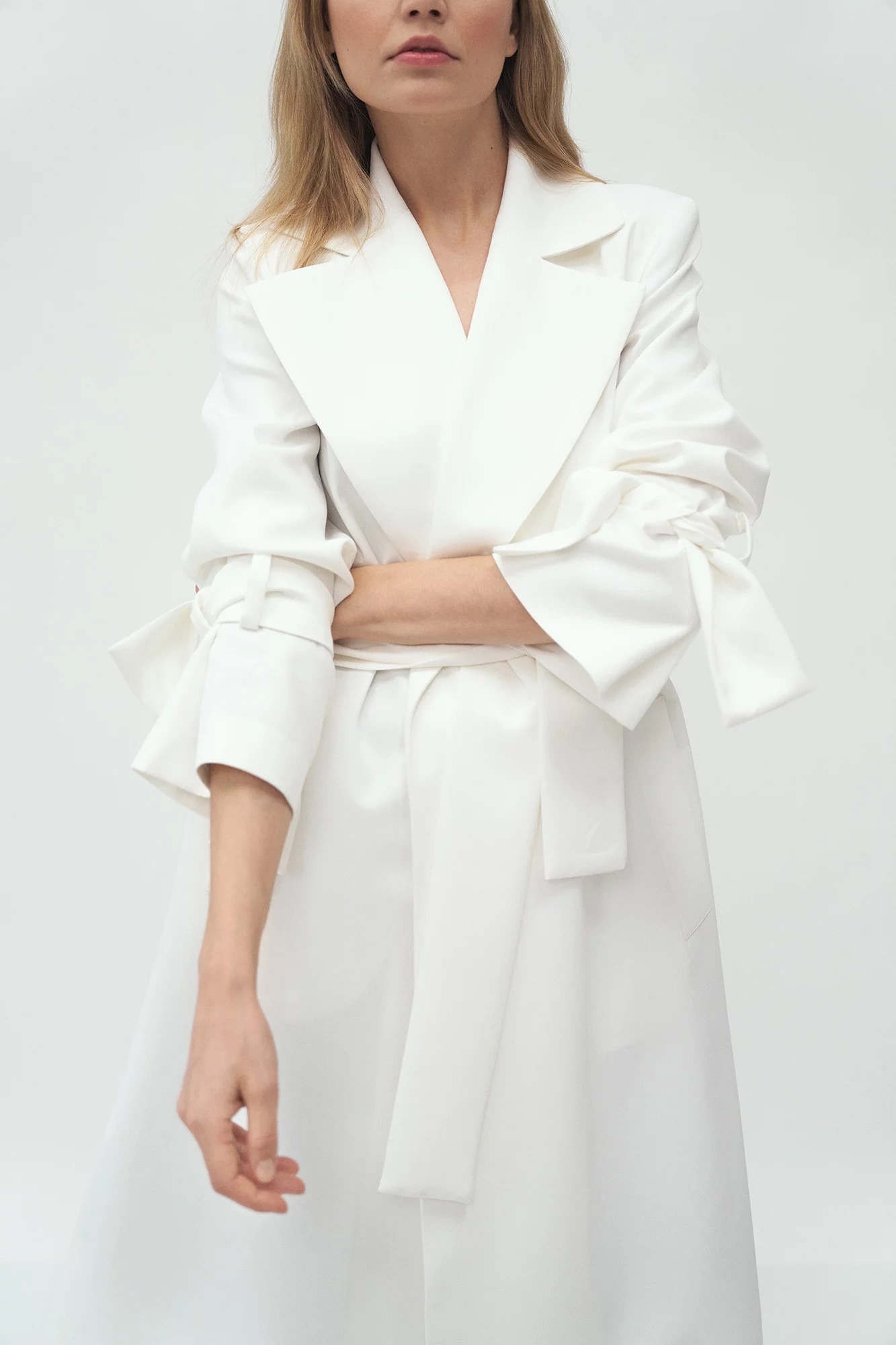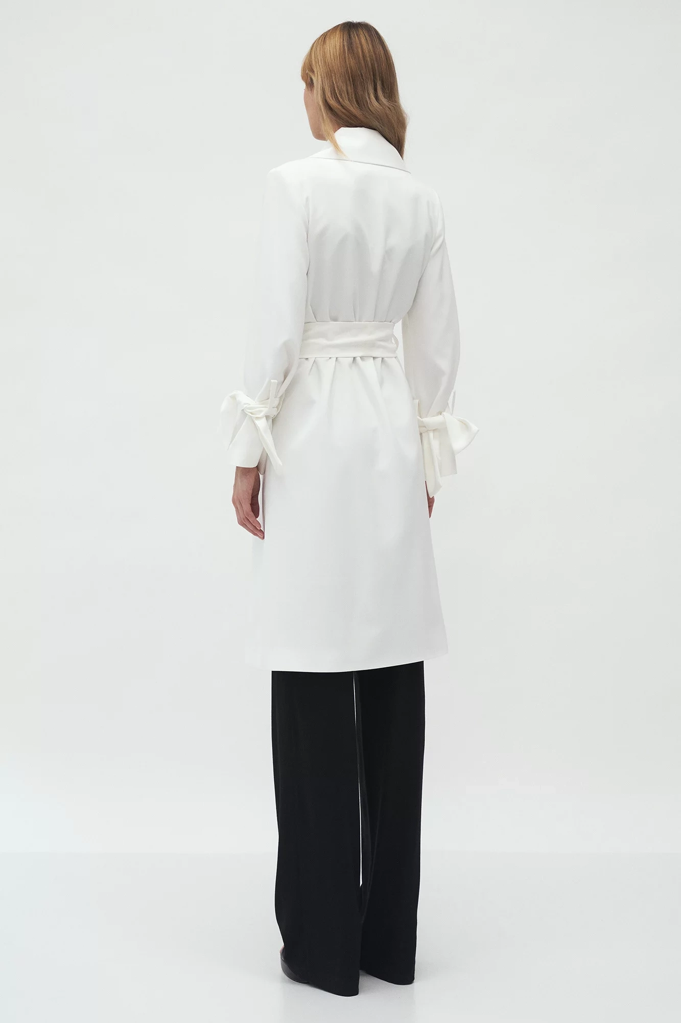 Kabát s dĺžkou ku kolenám, pásikom na zaviazanie v páse, širokými chlopňami a prednými vreckami. Pásky na zaväzovanie v manžetách umožňujú upraviť dĺžku rukávov.100% polyester Farba: ecru Kolekcia: Jar/Jeseň Pohlavie: Ženské
