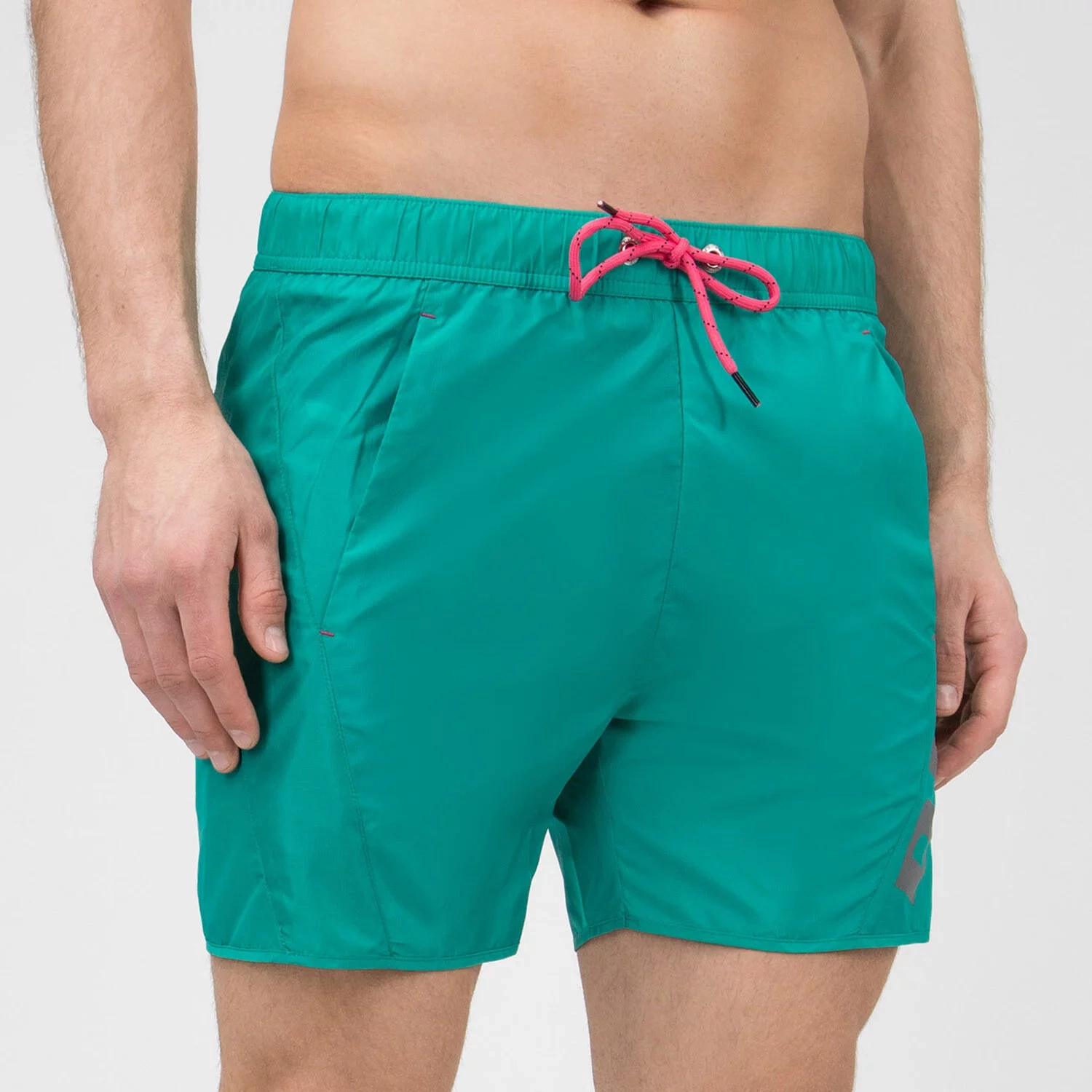 Pánske kúpacie kraťasy majú v páse gumu, šnúrku na stiahnutie a bočné vrecká.Na ľavej nohavici nápis