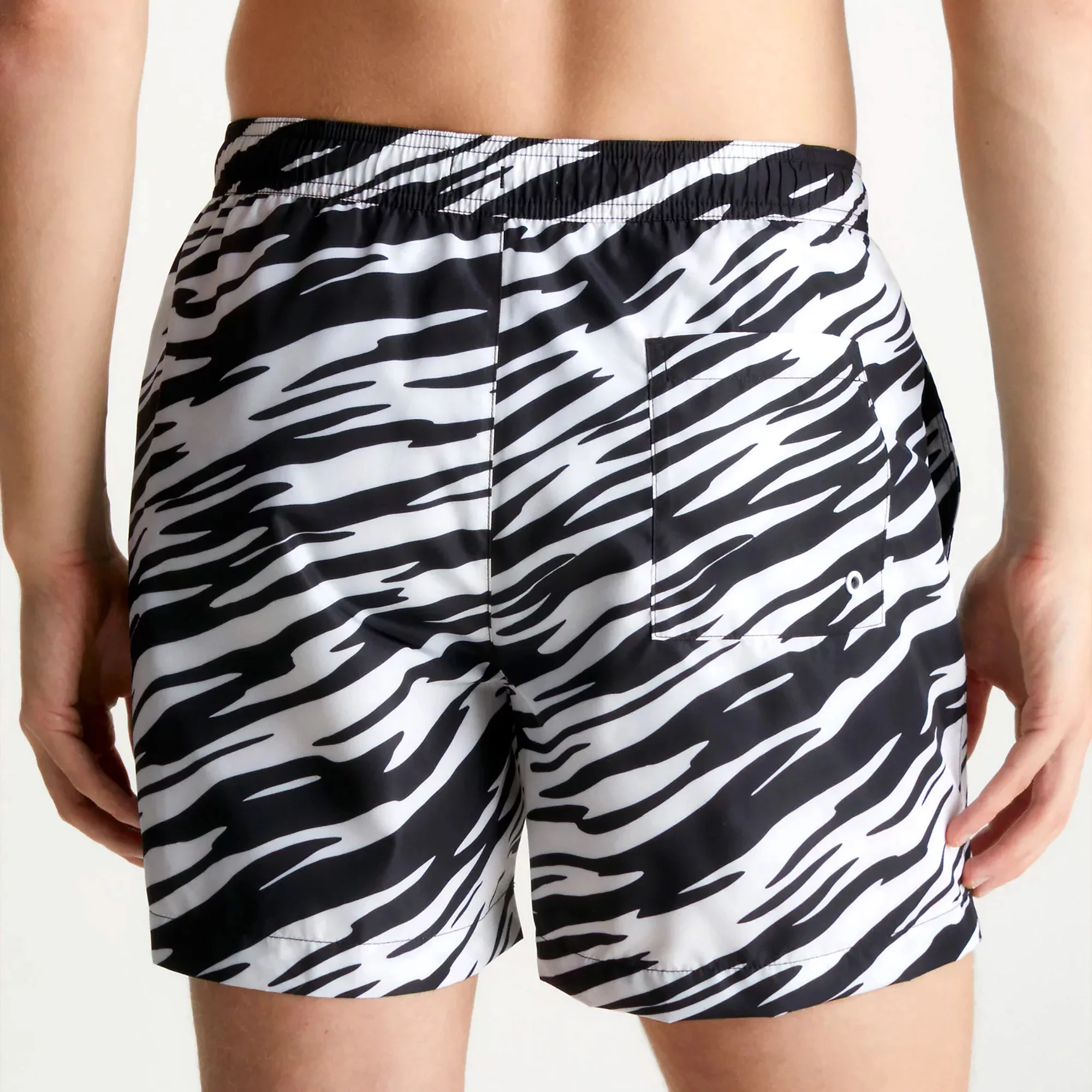 Design plavek zahrnuje boční a zadní kapsy pro pohodlné uložení drobností a zebří vzor, který dodává plavkám moderní a stylový vzhled.