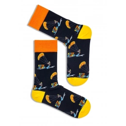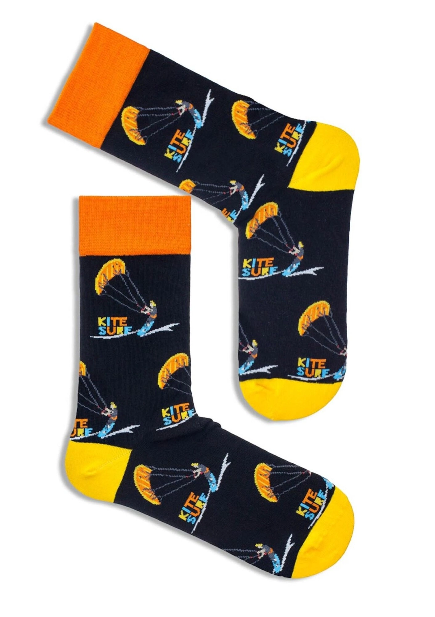 tyrkysovo modrá guma, čierne ponožky s potlačou surf, oranžová päta.