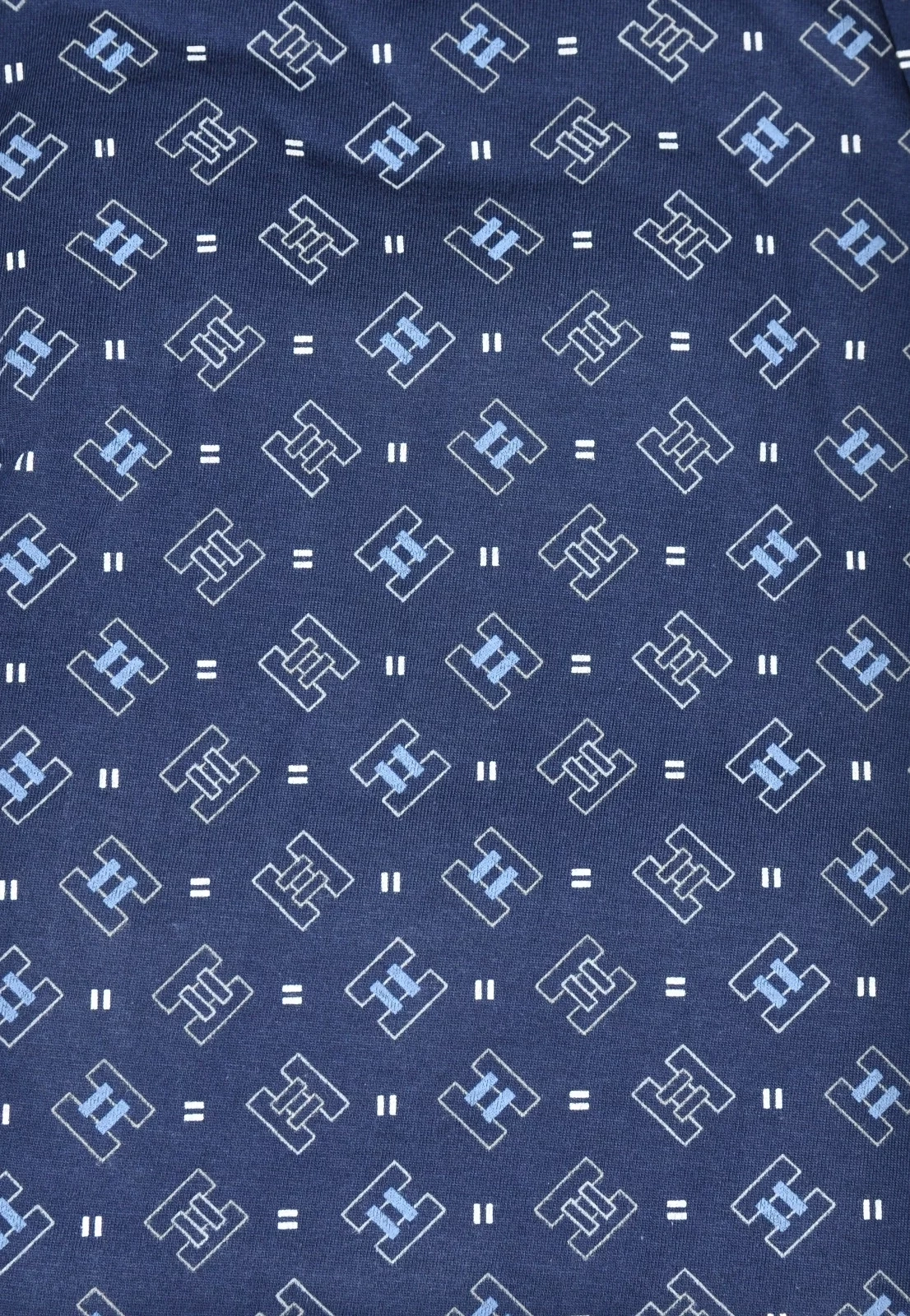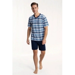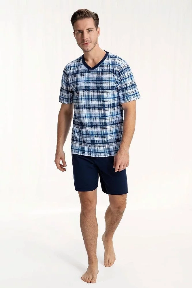 Vzorovaná blúza pyžamá má krátke rukávy a výstrih v tvare písmena "V". Komplet dopĺňajú voľné jednofarebné kraťasy.