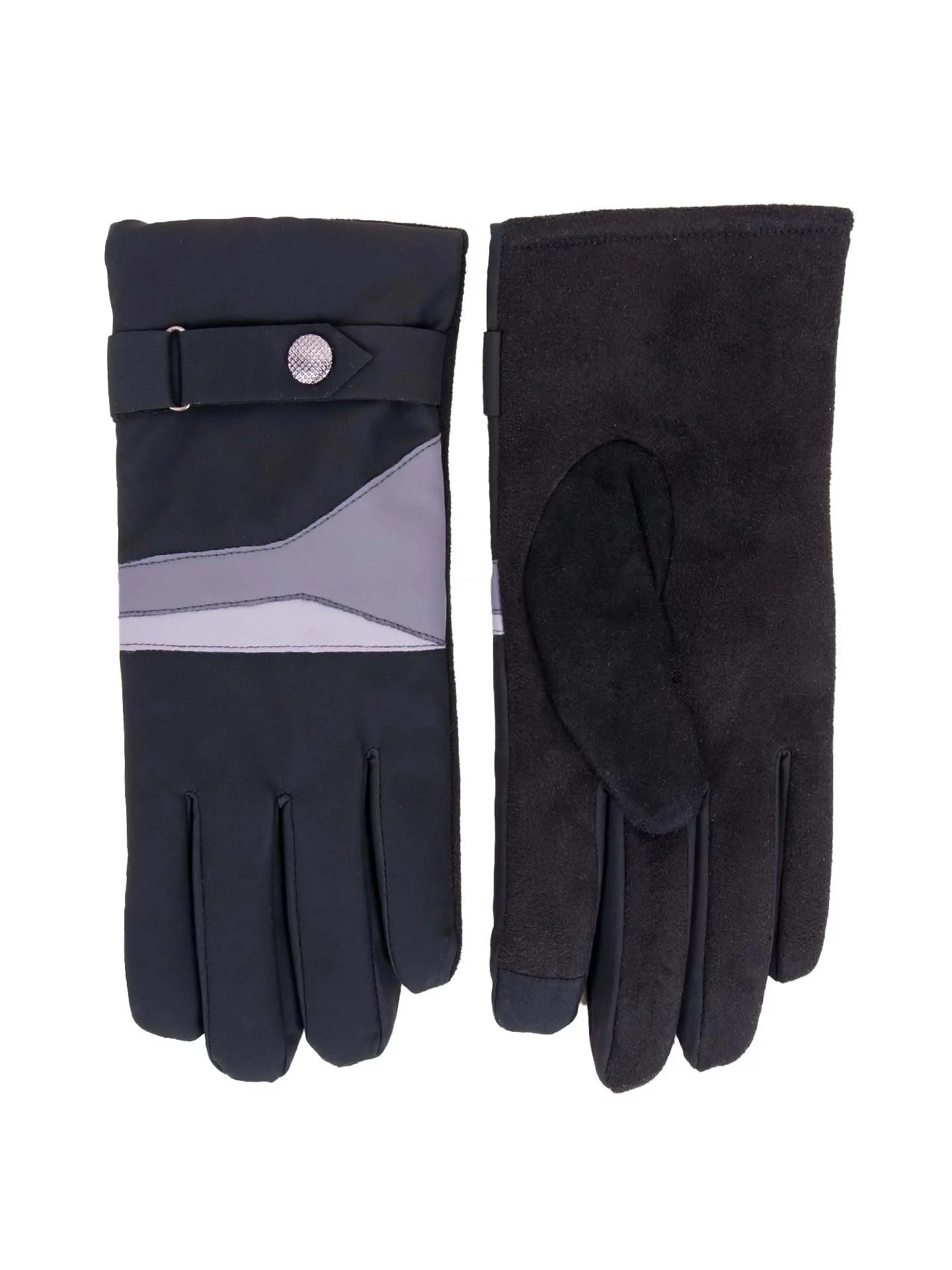 Elegantné pánske rukavice z príjemného materiálu. Ideálne na zimu. Vrchná časť je vyrobená z hladkého materiálu, spodná časť je semišová. Rukavice sú zdobené pruhmi materiálu v kontrastnej farbe. Na manžete je navyše ozdobné tlačidlo. Na vnútornej strane je horná časť rukavice dvojvrstvová. Na špičkách oboch ukazovákov je našitý materiál, ktorý umožňuje používať dotykové obrazovky.