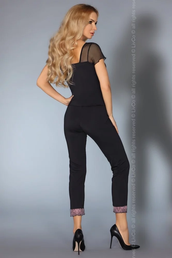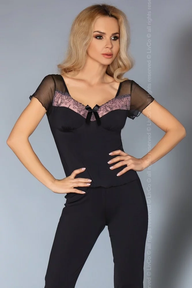 Dvojdielny komplet zložený z nohavíc a blúzky. Blúzka so sieťovými rukávmi, výstrih zdobený vyšívanou čipkou a mašličkou. Nohavice v 7/8 dĺžke, v páse na gumu, dĺžka nohavíc zakončená čipkou. Komplet vhodný ako pyžamo, tak aj domáci komplet.