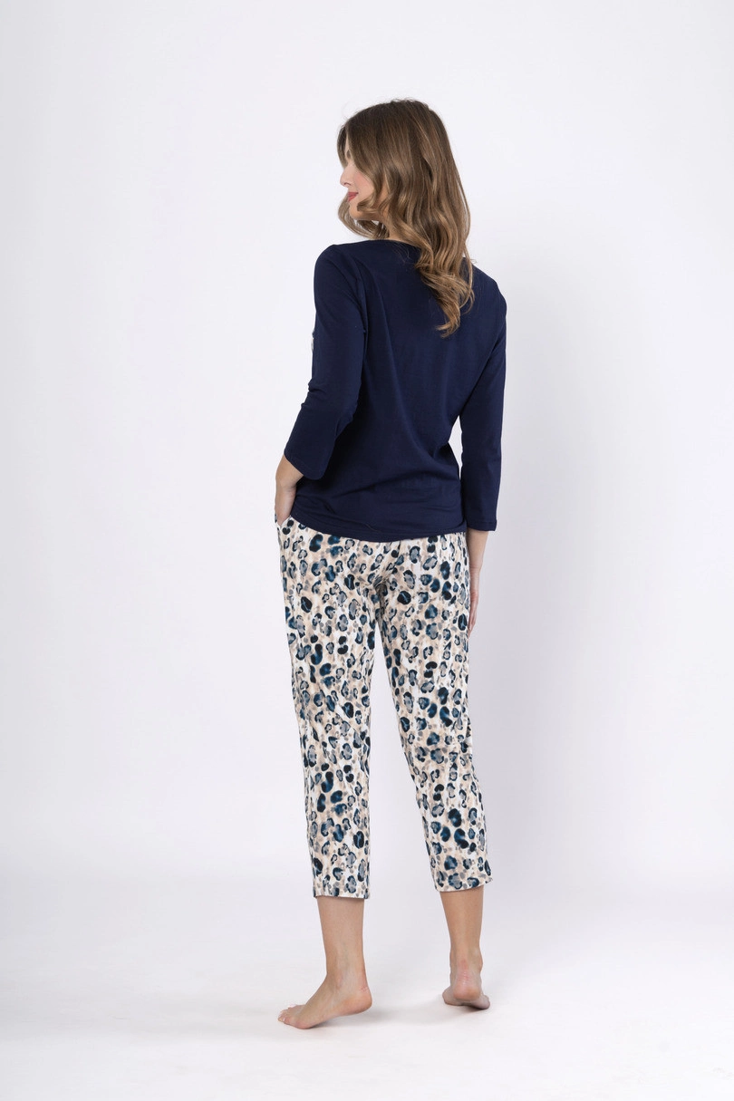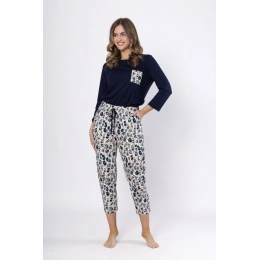 <p>Piżama damska Wiktoria 1664 marki Leveza to model z linii premium, łączący elegancję, komfort i wyjątkową jakość. Uszyta w całości z uszlachetnionej bawełny, jest niezwykle miękka, przewiewna i przyjazna dla skóry. Bluzka w kolorze granatowym z okrągłym dekoltem i rękawami 7/8 została ozdobiona kontrastową kieszonką, która dodaje jej nowoczesnego charakteru. Do kompletu dobrano spodnie o długości 7/8 w modny, zwierzęcy wzór panterki w odcieniach beżu i granatu. Wyposażono je w kieszenie oraz dekoracyjny troczek w pasie, co zapewnia wygodę i praktyczność. Całość dostępna w rozmiarach M–2XL to doskonała propozycja dla kobiet, które chcą czuć się stylowo i komfortowo także w domowym zaciszu.</p>