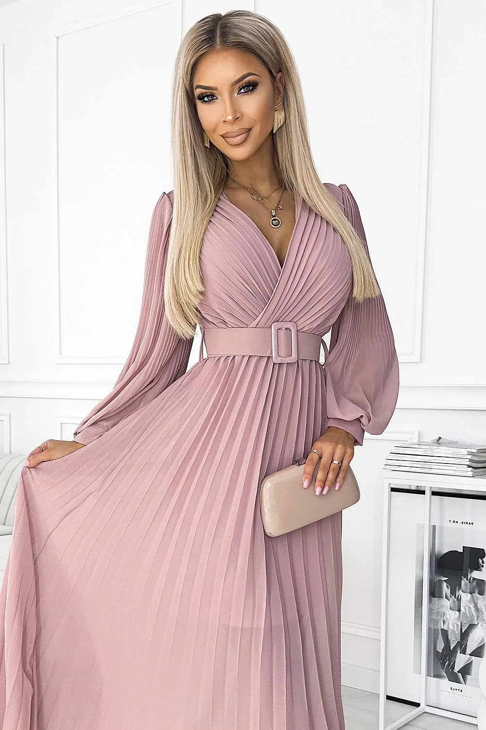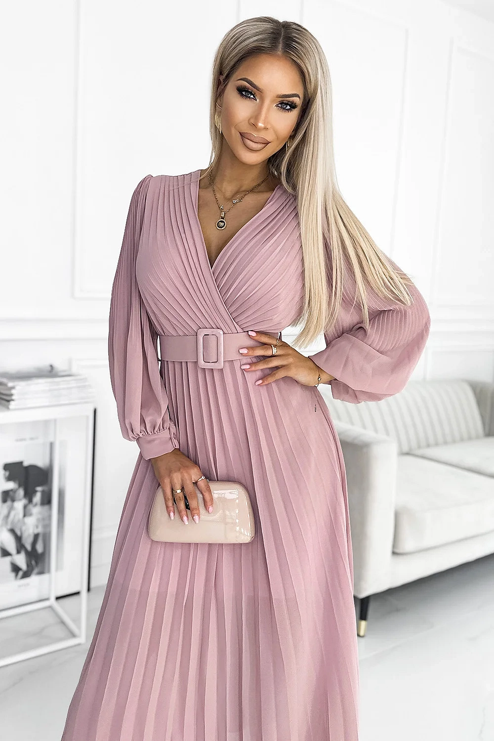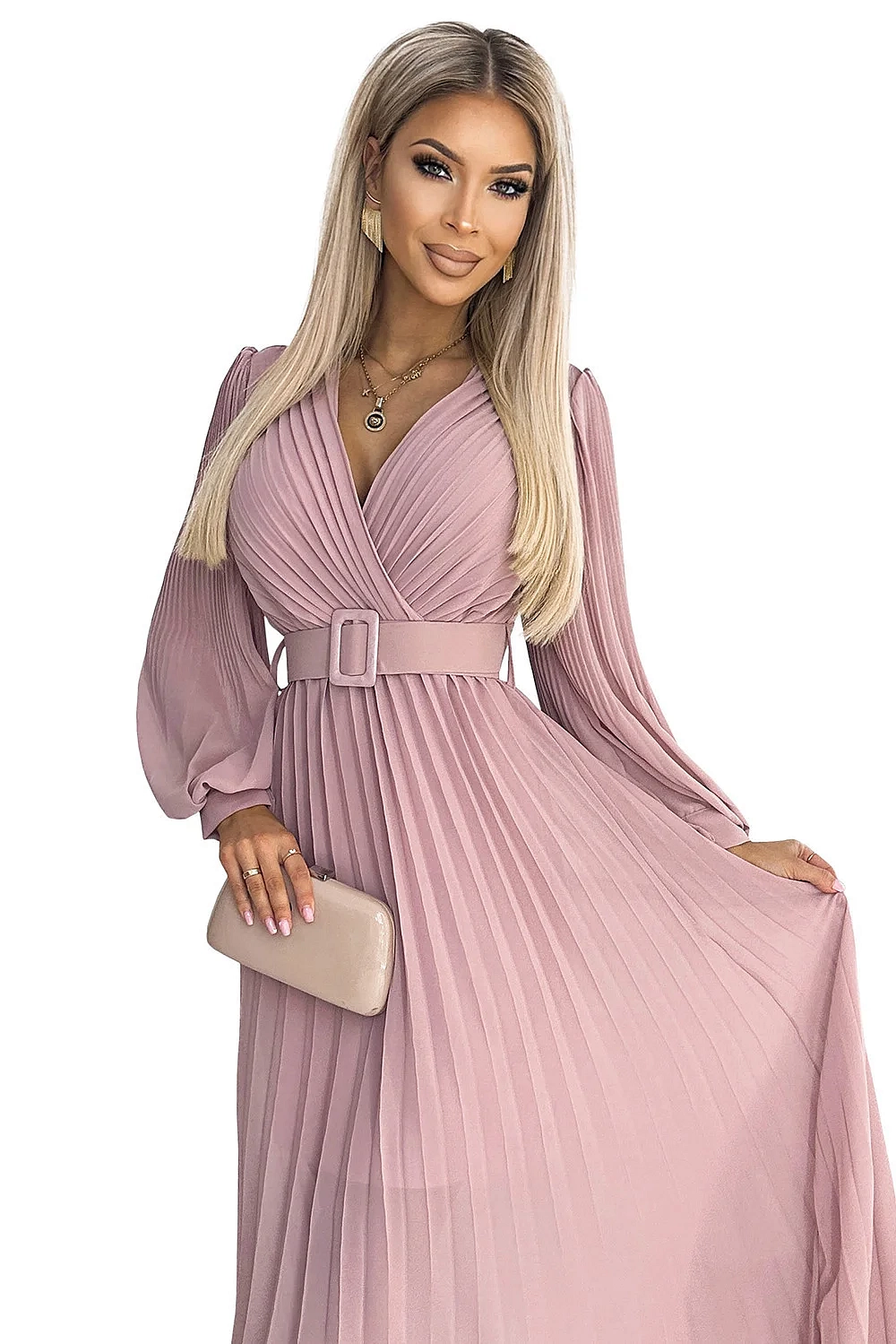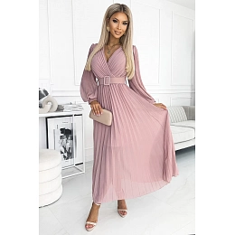Klara - plisované šifónové šaty s výstrihom, dlhým rukávom a opaskom. plisovanie na výstrihu a rukávoch dodáva šatám eleganciu. farba: púdrovo ružová. značka numoco .