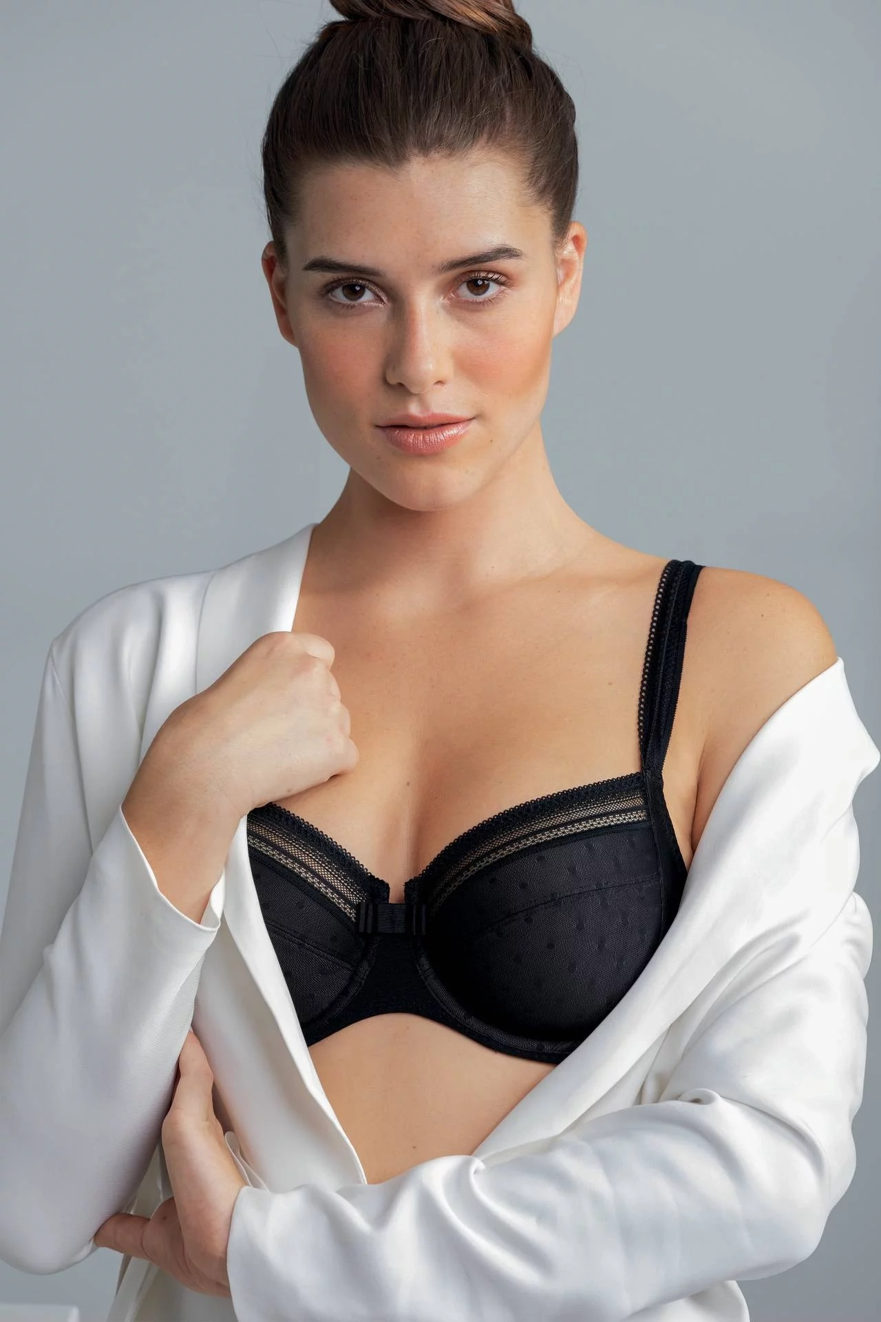 Podprsenka s kosticou, košíčkami T-strihu, vyšívaný tyl v spojený s čipkou.