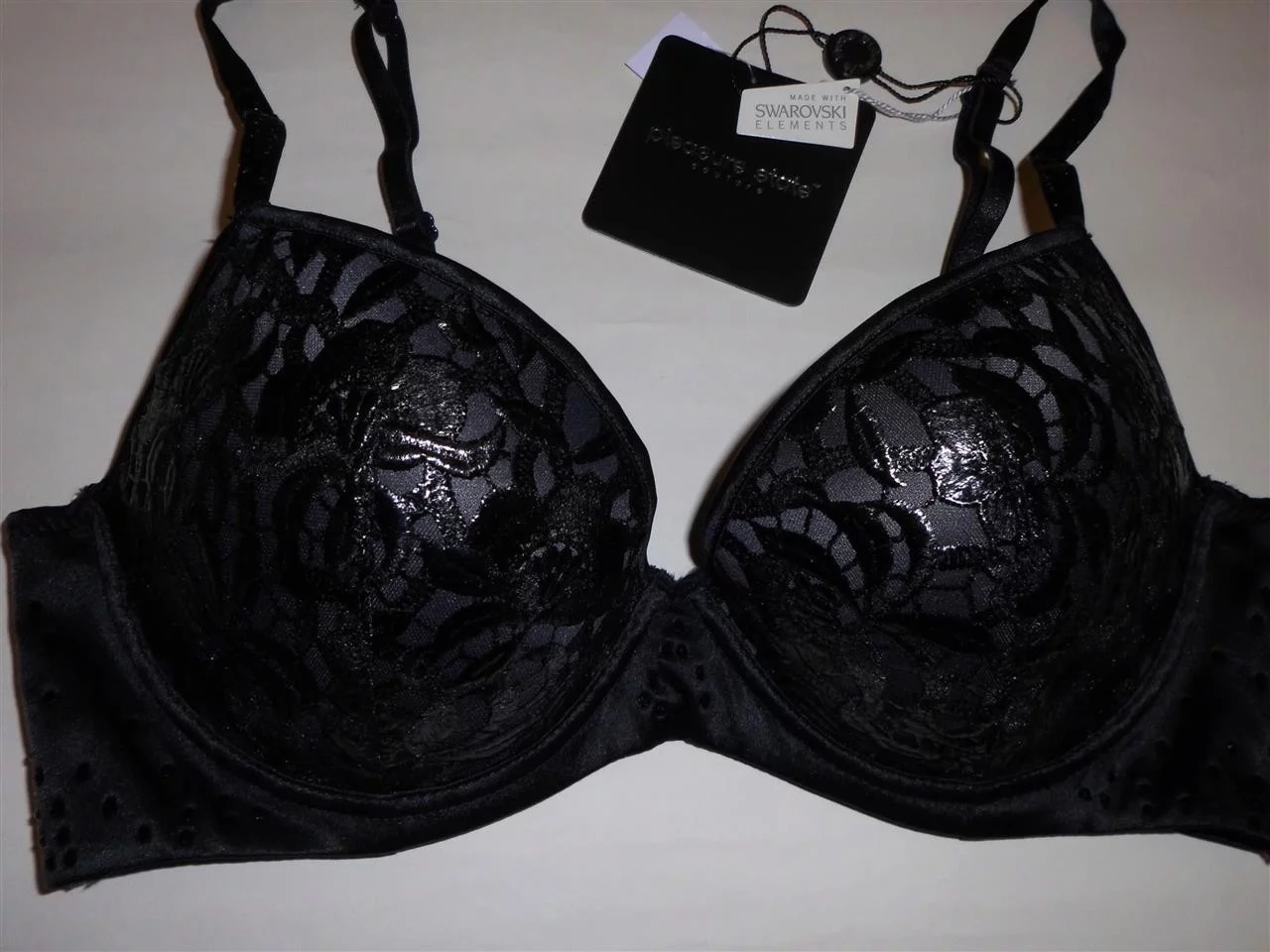 Podprsenka P86-1238C - Pleasure State , vystužená s lesklou čipkou na hladkom čiernom podklade, obvod podprsenky je hladký, zdobený malými kamienkami - Swarovski elements, ramienka taktiež.