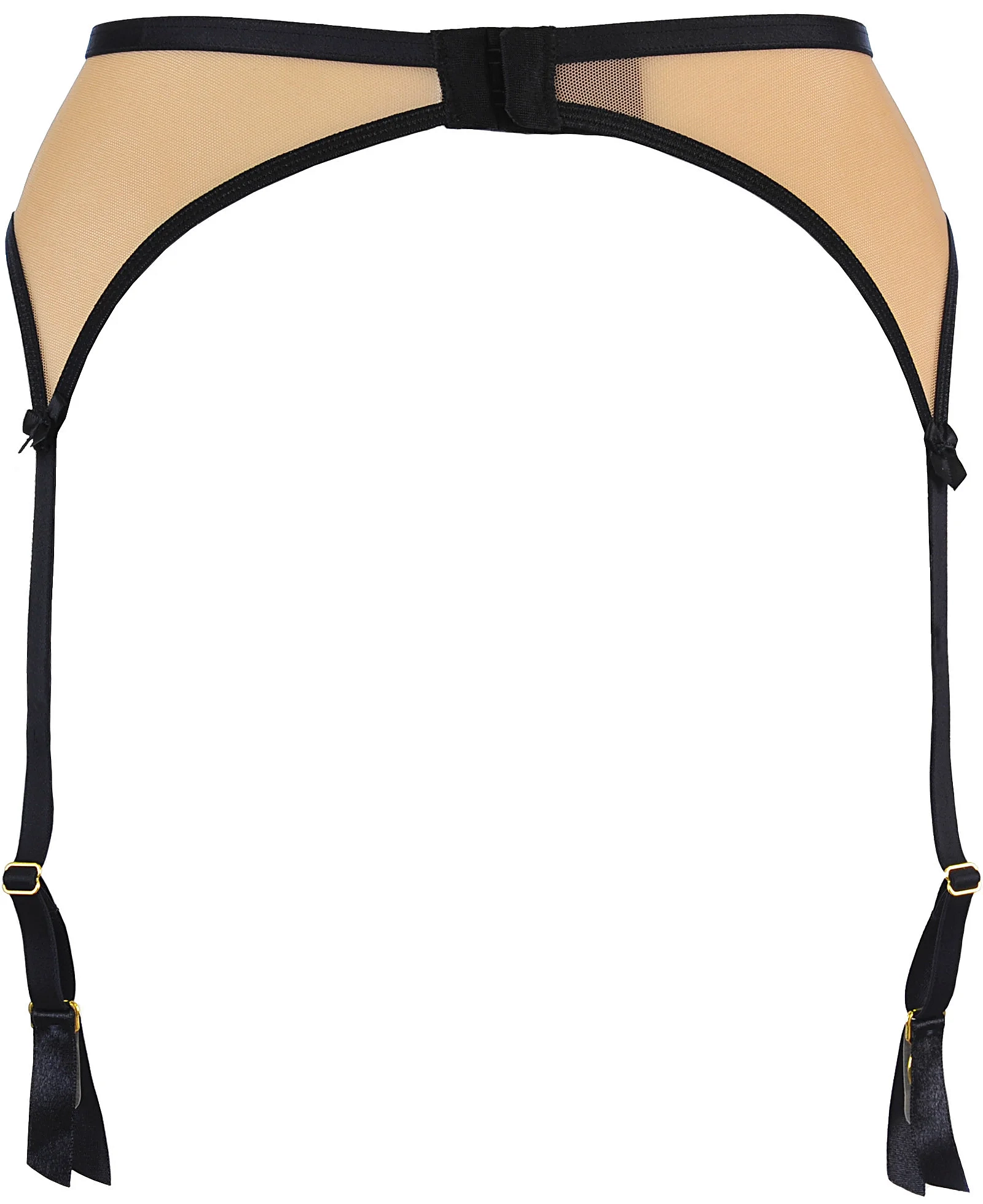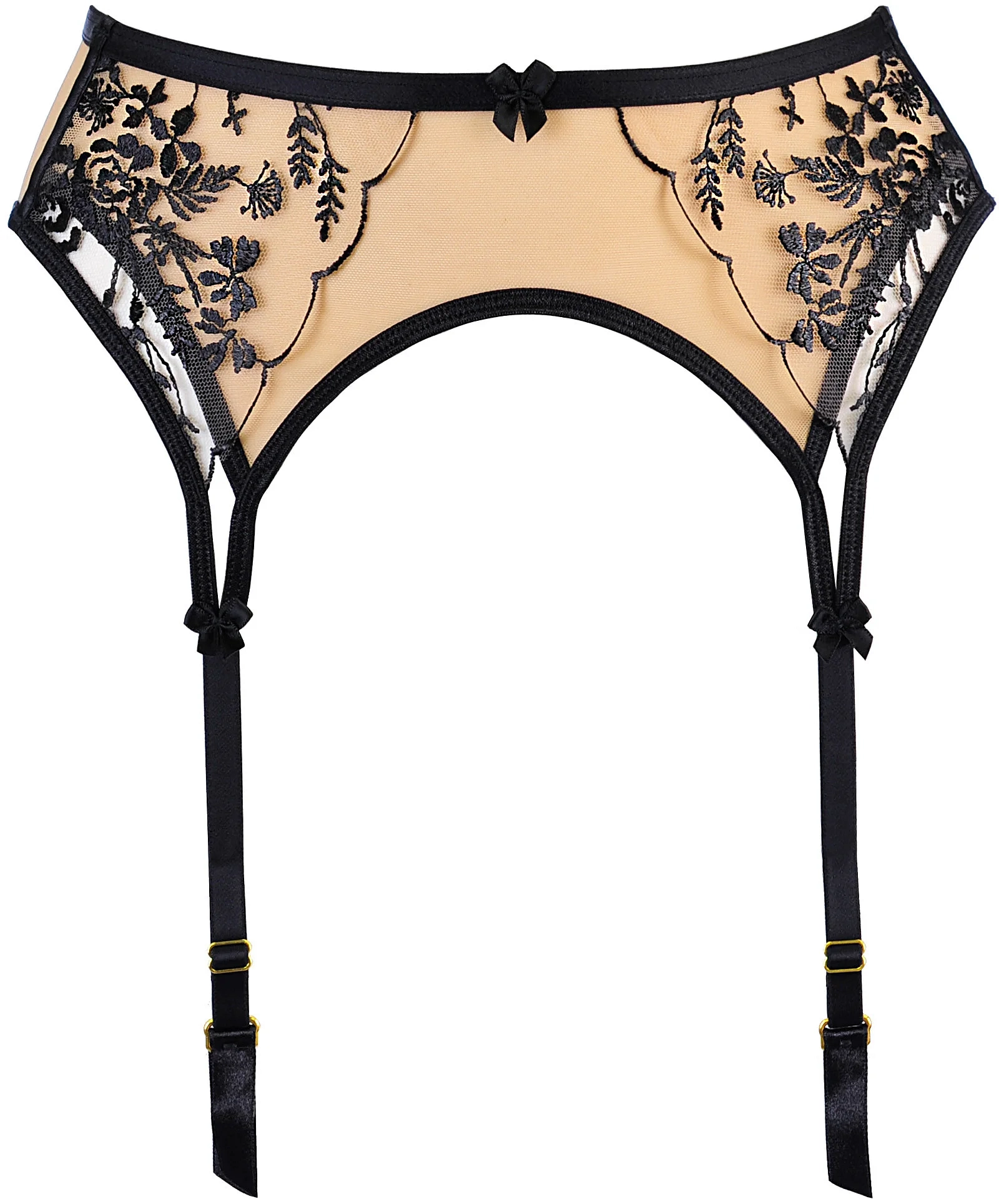 Mäkký a decentný podväzkový pás s jemným čiernym, kvetinovým vzorom je nežným doplnkom, ktorý premení celý outfit. Dodá mu charakter a šarm, vďaka ktorému sa budete cítiť zmyselne a zvodne. Pás je podšitý nude tylom a je vybavený podväzkovými nástavcami, zapína sa výšivkou s dvojitým háčikom. Akcenty a regulátory sú v zlatej farbe. Zabudované bočné kostice zvýrazňujú štruktúru.Materiálové zloženie: polyamid 85%, polyester 11%, elastan 4%