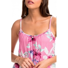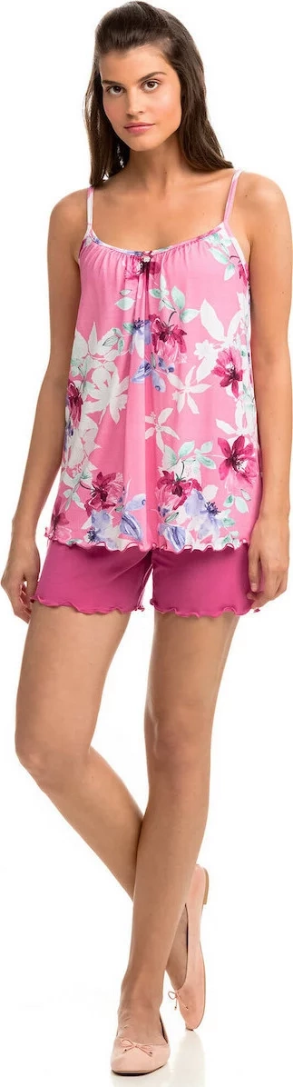 Dvojdielne dámske pyžamo na pohodlné spanie. Komplet pozostáva z elegantnej košieľky s volánikmi na leme, ktorú dopĺňajú krátke šortky. Set je vyrobený z vysoko kvalitného Micro-modalu s prímesou Elastanu. Prírodný Micro-modal poskytuje výnimočnú mäkkosť, ľahkosť a pohodlie, je priedušný, pri praní sa nezráža, dobre absorbuje pot a rýchlo schne, zatiaľ čo Elastan dodáva odevu potrebnú pružnosť.