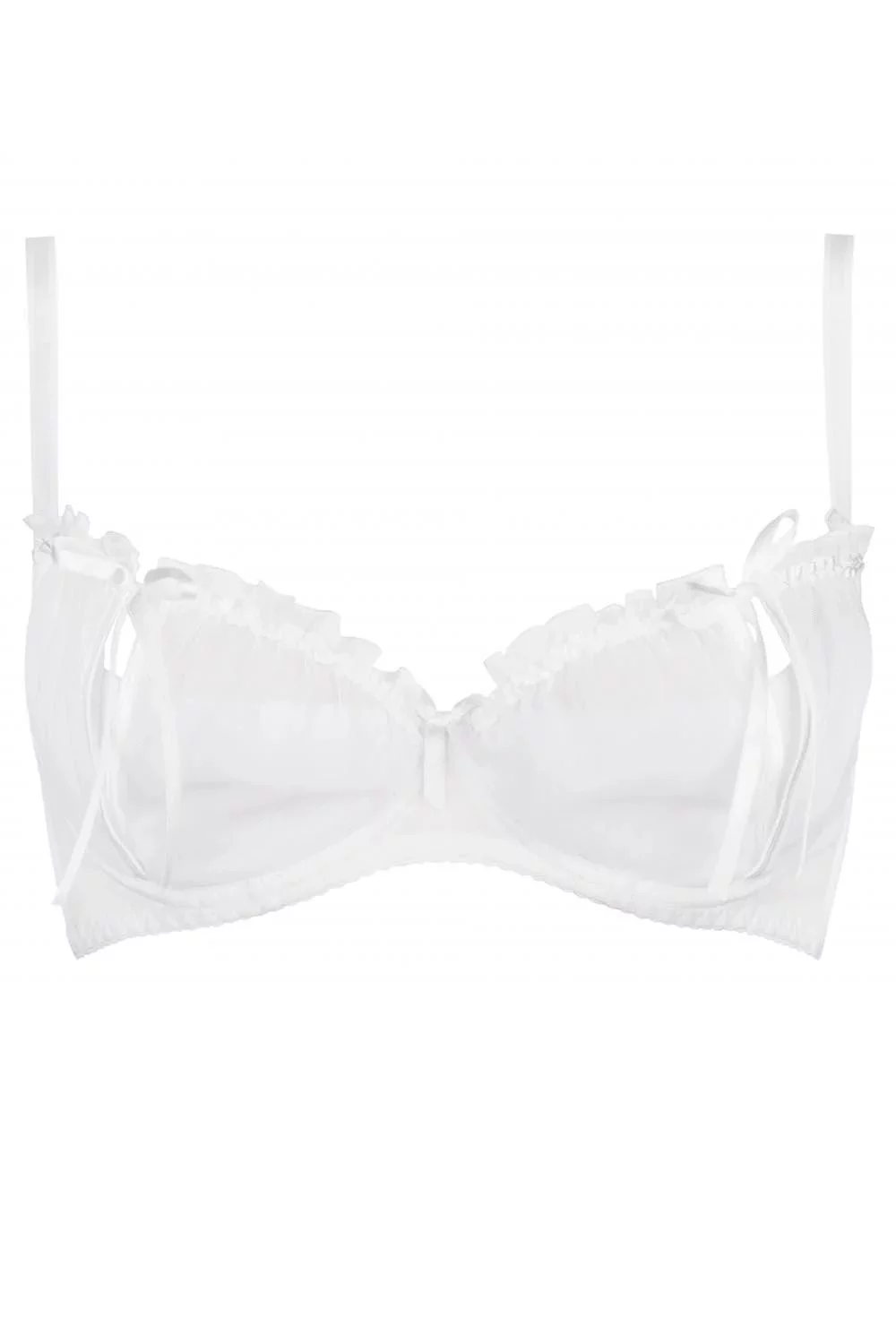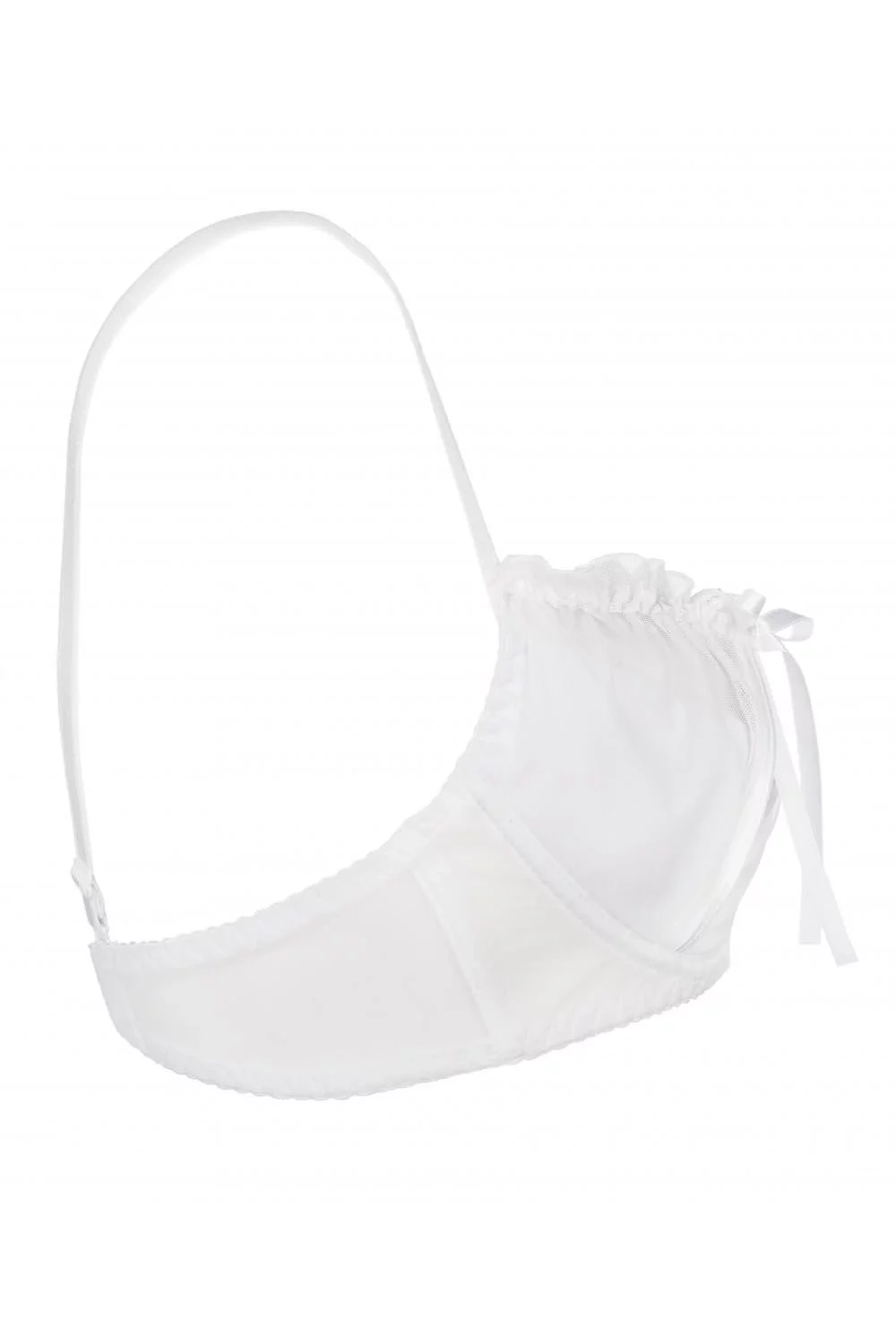 Zmyselná snehovo biela polopodprsenka Neige, ktorá zvádza svojimi neprehliadnuteľnými prestrihmi košíčkov.Polopodprsenka je vyrobená z jemnej tylovej sieťovinky, ktorá podčiarkne a zdôrazní vašu ženskosť a zmyselnosť. Na kráse dodávajú modelu hravé mašličky. Model má bočné kostice. Ramienka je možné nastaviť, ale nemožno ich odopnúť. Zapínanie je na dva háčiky s trojstupňovou možnosťou nastavenia veľkosti obvodu.Súprava vytvoríte spoločne s nohavičkami string a podväzkovým pásom Neige.