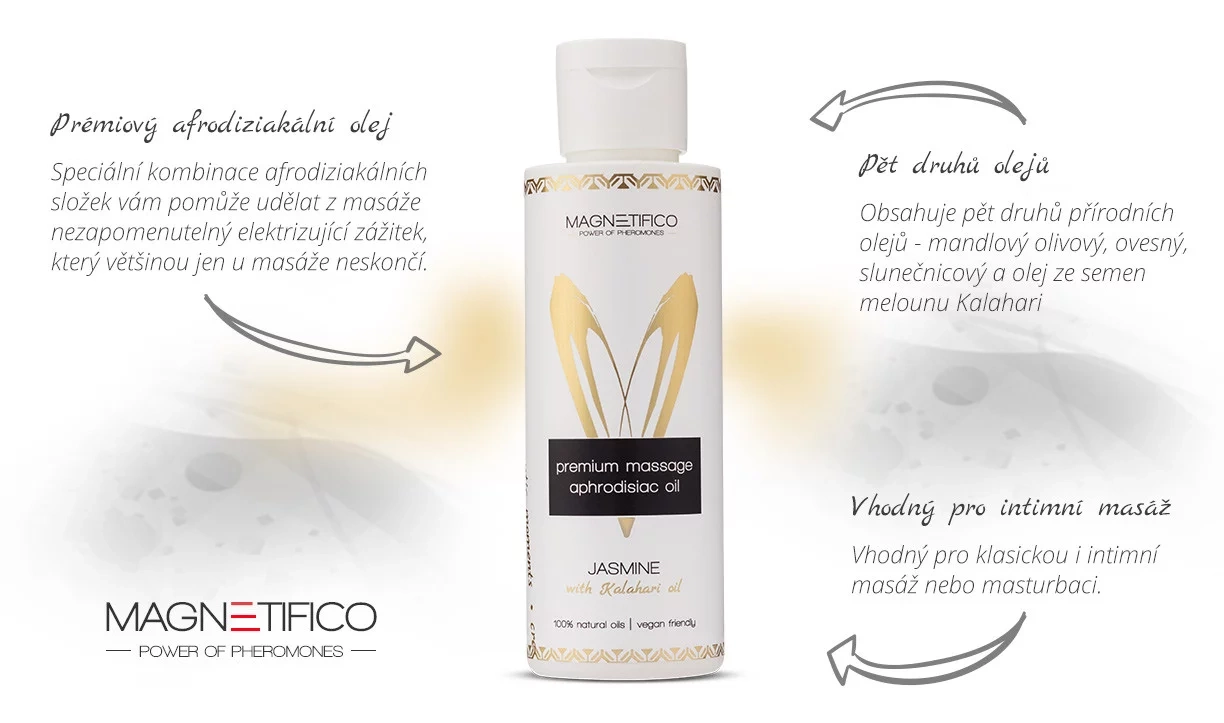 Nechajte sa rozmaznávať a prežite nezabudnuteľné chvíle plné vzrušenia i relaxácie. Tento masážny olej z radu MAGNETIFICO – power of pheromones bol navrhnutý tak, aby zaistil optimálnu klzkosť a nebol zároveň príliš mastný a prirodzene sa tak vstrebal do pokožky. Špeciálna kombinácia afrodiziakálnych zložiek vám pomôže urobiť z masáže nezabudnuteľný elektrizujúci zážitok, ktorý väčšinou len pri masáži neskončí.