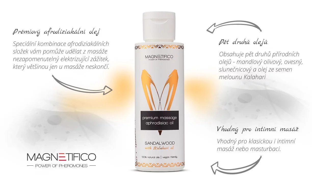 Nechajte sa rozmaznávať a prežite nezabudnuteľné chvíle plné vzrušenia i relaxácie. Tento masážny olej z radu MAGNETIFICO – power of pheromones bol navrhnutý tak, aby zaistil optimálnu klzkosť a nebol zároveň príliš mastný a prirodzene sa tak vstrebal do pokožky. Špeciálna kombinácia afrodiziakálnych zložiek vám pomôže urobiť z masáže nezabudnuteľný elektrizujúci zážitok, ktorý väčšinou len pri masáži neskončí.
