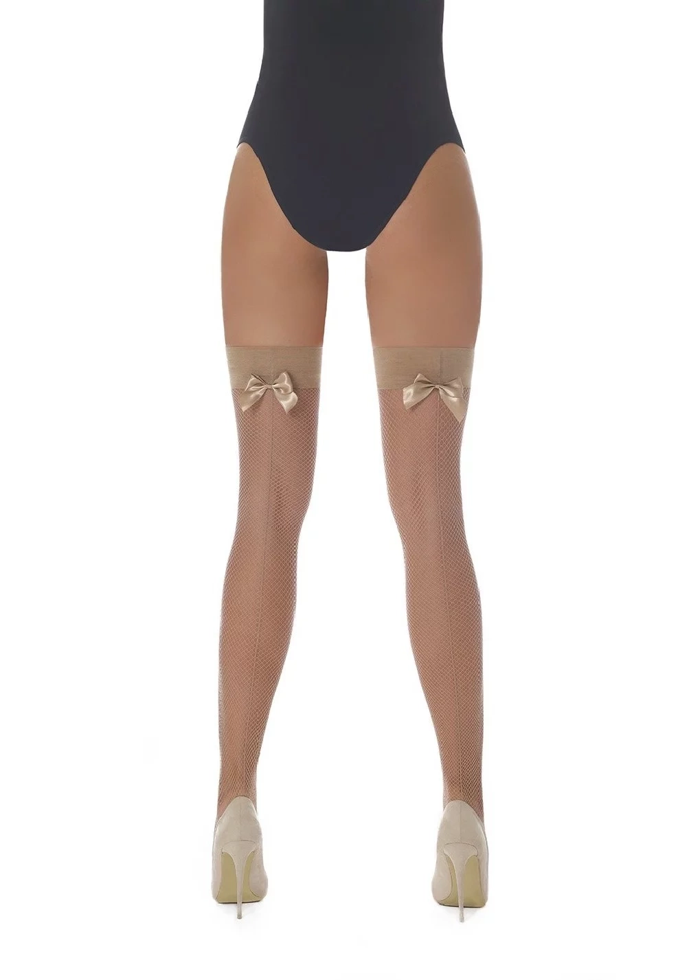 Sieťované pančuchy s ažúrou od stehien až po pätu, v leme sú dva silikónové pásiky, ktoré chránia proti posunutiu. Na zadnej strane stehien saténová mašlička. 20 DEŇ