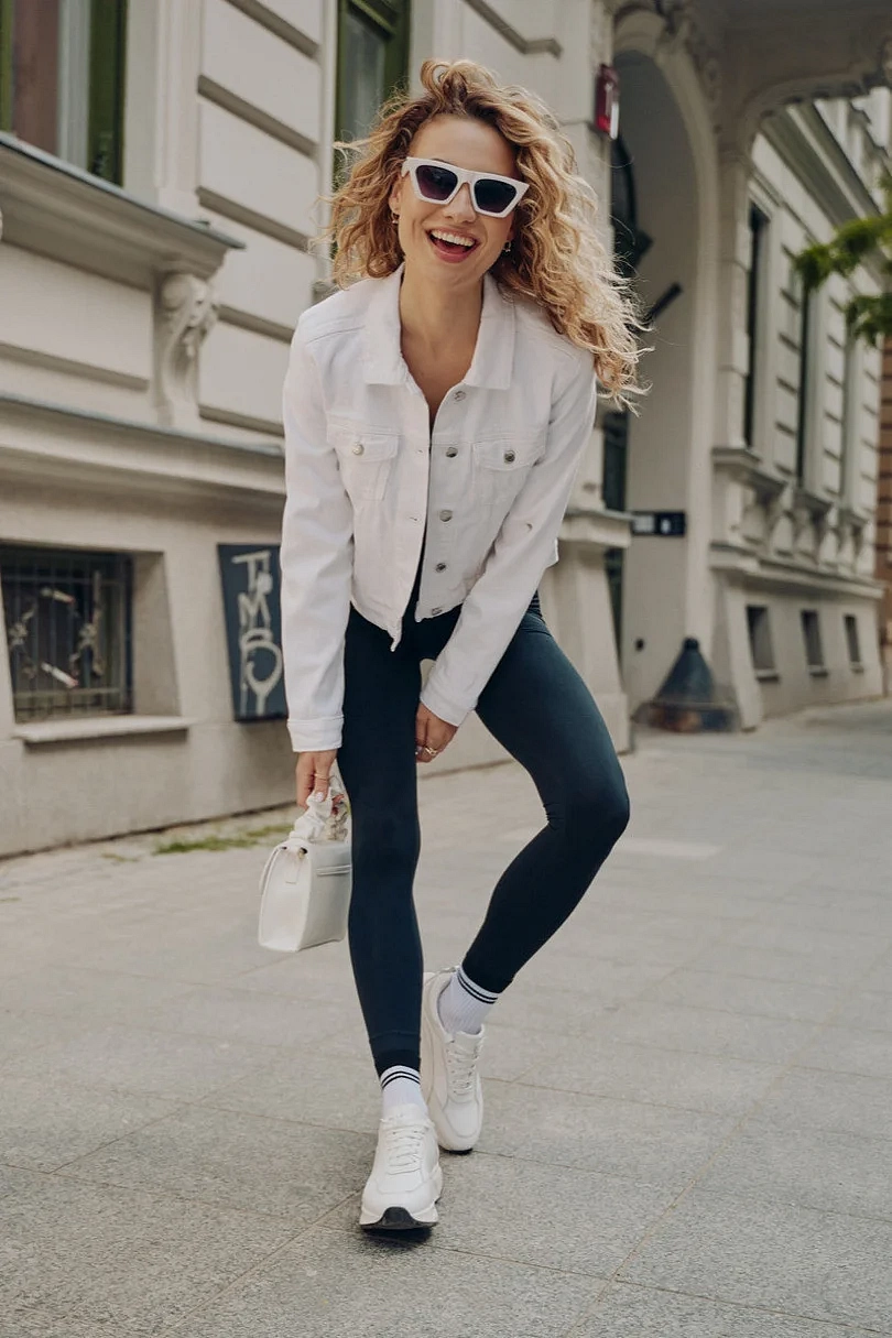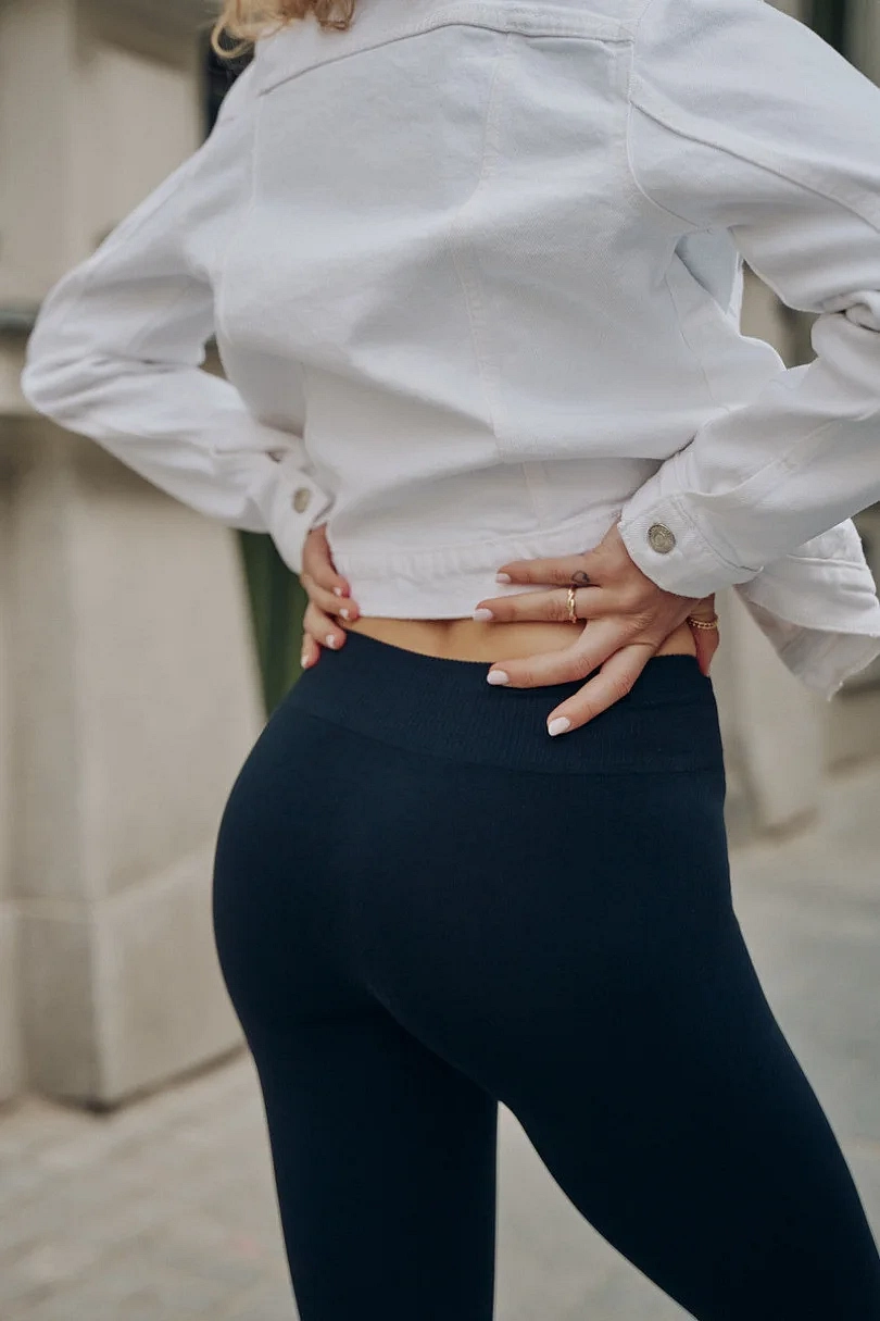 Czarne kryjące legginsy z wysokim stanem odpowiednio opinają talię, spłaszczając optycznie i podtrzymując brzuch. Dopasowana nogawka nie ściąga się i nie marszczy, a elastyczna gumka w pasie zapewnia wygodę noszenia legginsów z wysokim stanem i utrzymuje je na właściwym miejscu. Legginsy bezszwowe nie krępują ruchów, tworząc efekt second skin.