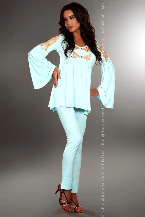 Dámske pyžamo Chloe LivCo obsahuje blúzku s dlhými rukávmi, ozdobená hnedým vyšívaním voľnejšieho strihu. Dlhé nohavice upnutejšieho strihu. Materiálové zloženie: 94% Viskoza, 6% Elasten. Farba: svetlo modrá. Veľkosť: S, M, L, XL.