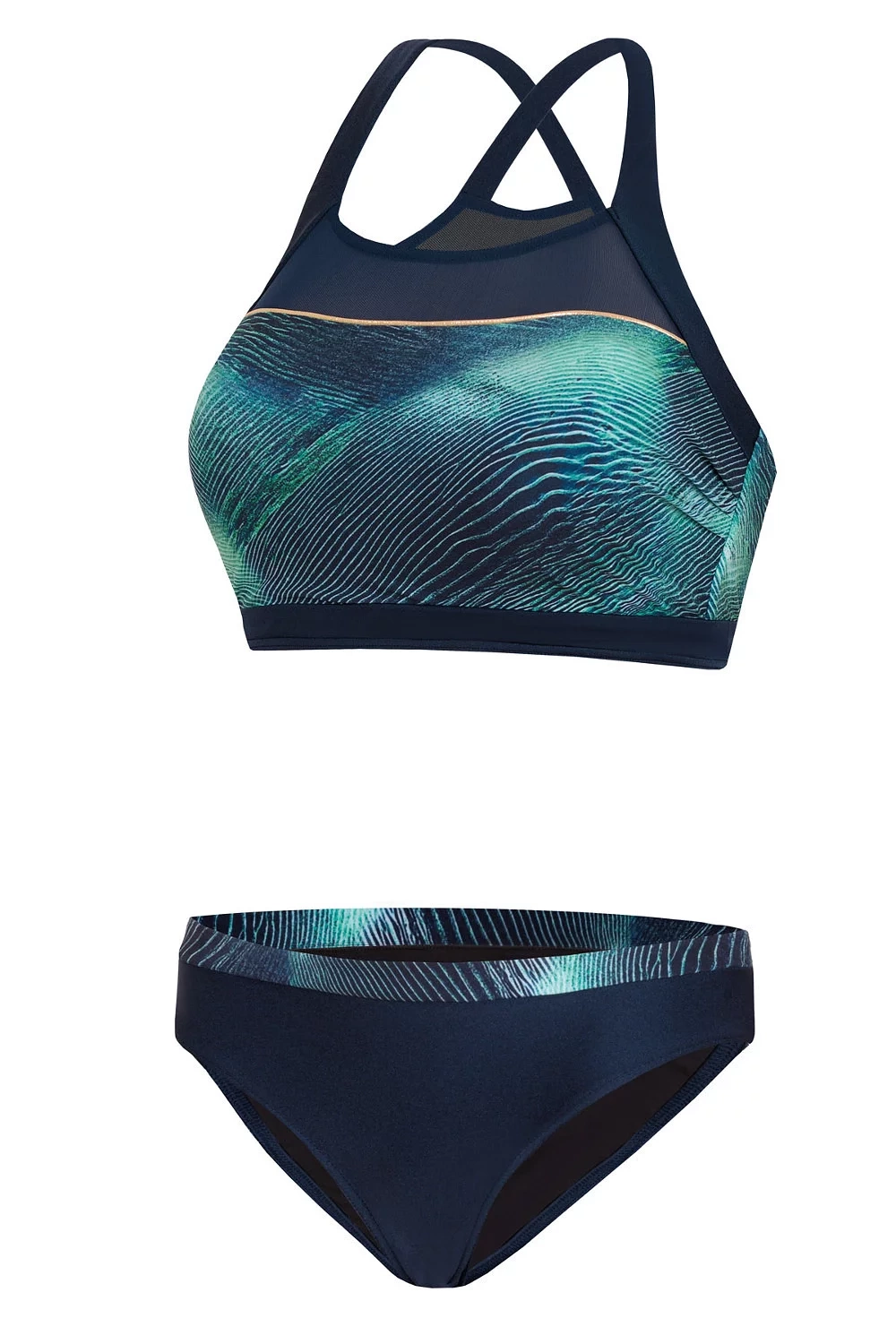 Efektné dvojdielne dámske plavky so športovým strihom, ktoré sú vyrobené zo vzorovaného mikrovlákna.