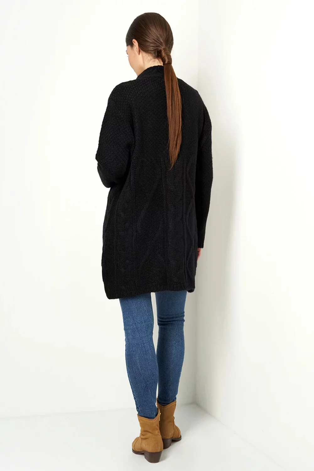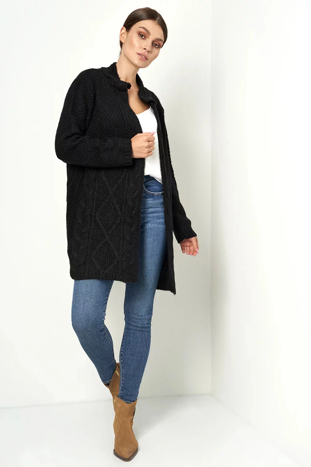 Víza so stojačikom. Kardigan je nepostrádateľnou súčasťou jesenného oblečenia. Originálna väzba dodáva svetru jeho charakter.
