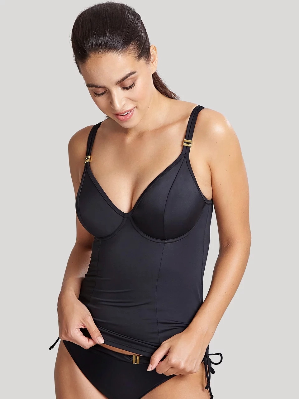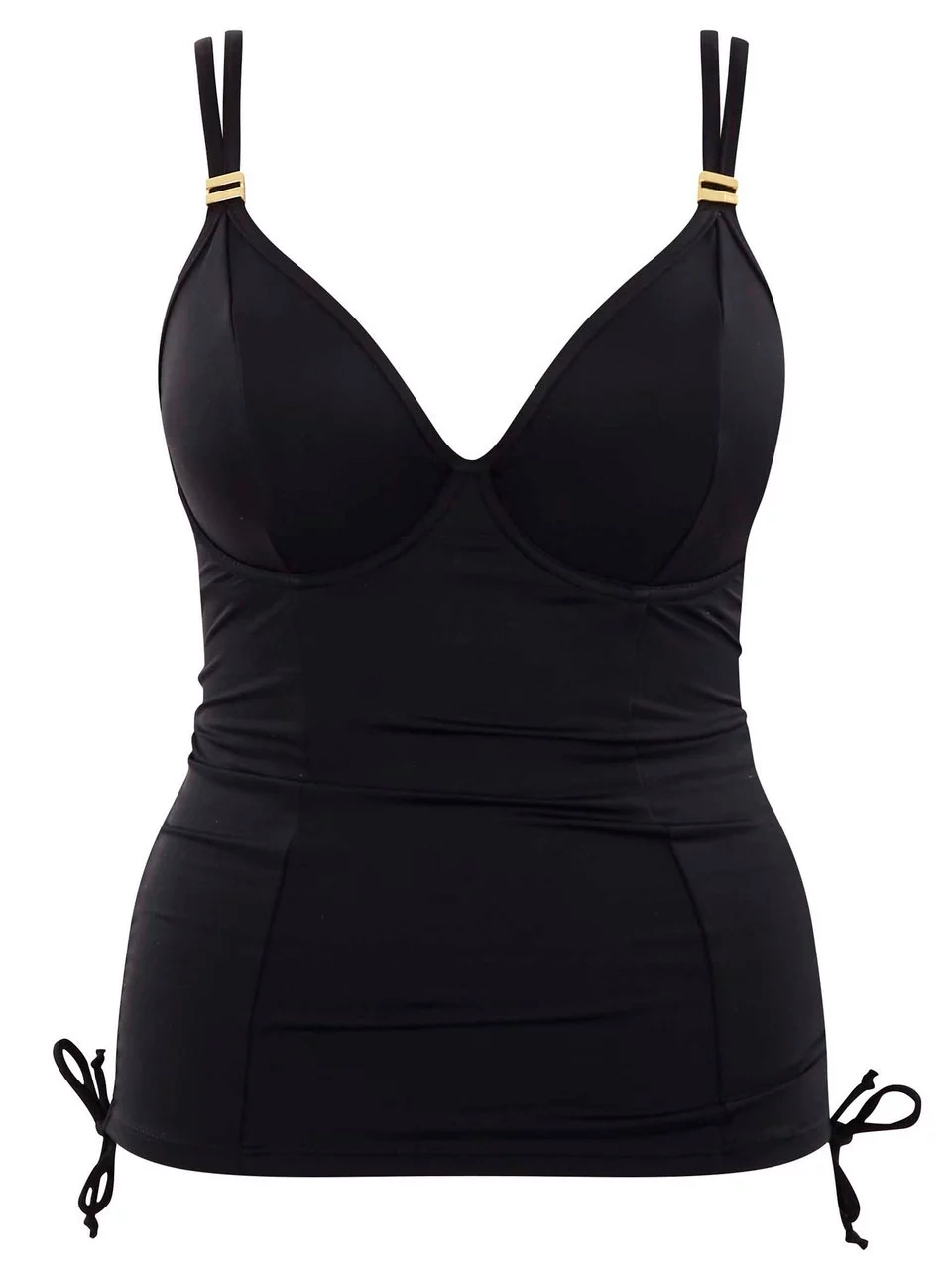 V plavkách Anya Riva Tankini sa môžete cítiť elegantne a sofistikovane. Tieto všestranné tankiny s lichotivým výstrihom a vnútornými nevypchatými košíčkami poskytujú skvelú oporu od košíčkov D až po J. Jej drobné detaily, vrátane delených popruhov, sťahovacích šnúrok na bokoch a zlatej povrchovej úpravy, pôsobia luxusným dojmom. Pokiaľ chcete mať univerzálnosť bikín, ale zároveň zakryť plavky, sú pre vás tankiny tou správnou voľbou! Košíčky sú s kosticou, bez vypchávok (s dvojitou podšívkou) poskytujú skvelú oporu. Vnútorné krídelká z powermeshovej sieťoviny poskytujú podporný a pohodlný tvar okolo tela. Skryté vnútorné zapínanie na chrbte so zapínaním na háčik a očko, pre možnosť prispôsobenia veľkosti.Nastaviteľné ramienka. Zakončené zlatým lemovaním pre väčší luxus.