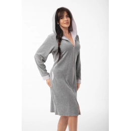 <p>Krótki szlafrok damskie z kapturem zapinany na zamek uszyty z bawełny z dodatkiem poliestru. Kaptur oraz rękawy wykończone kontrastującym materiałem. Na wysokości bioder kieszenie. </p> <p>Skład: 80% Bawełna, 20% Poliester</p> <p> </p>