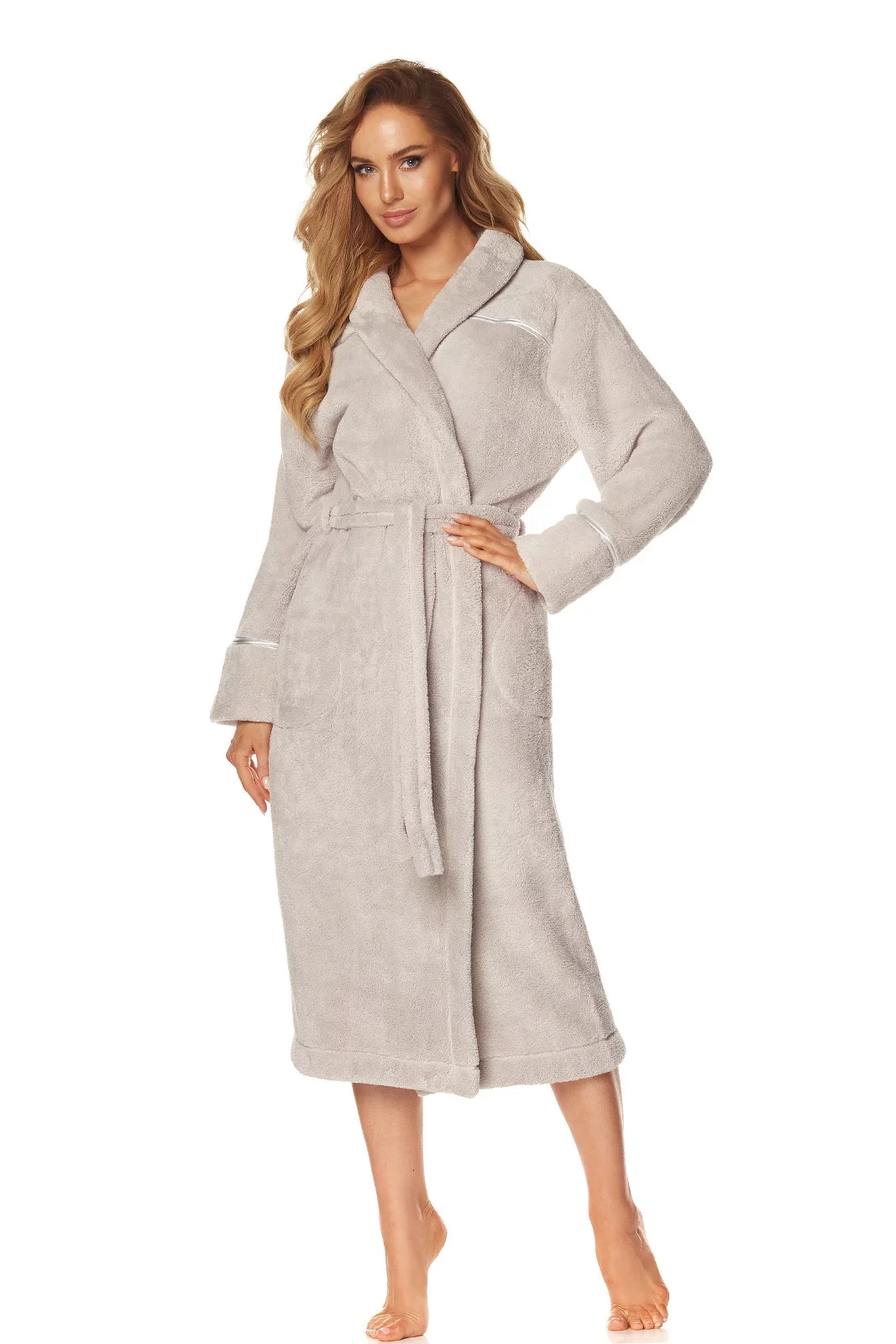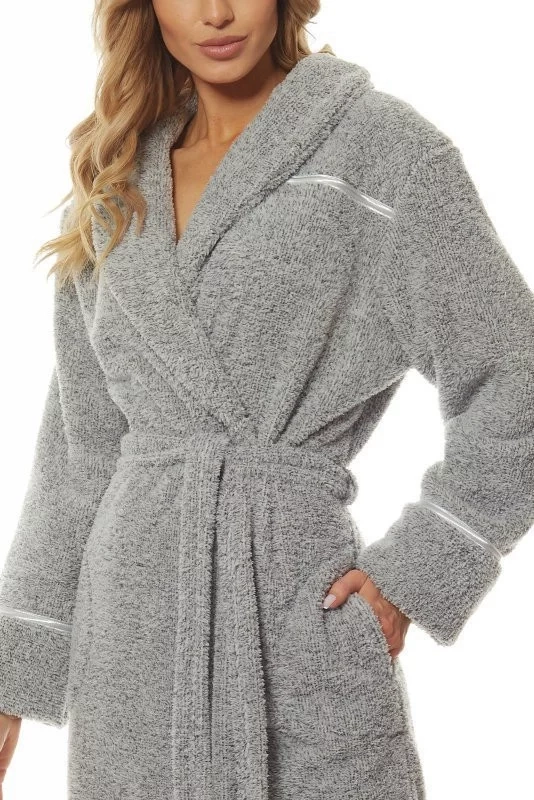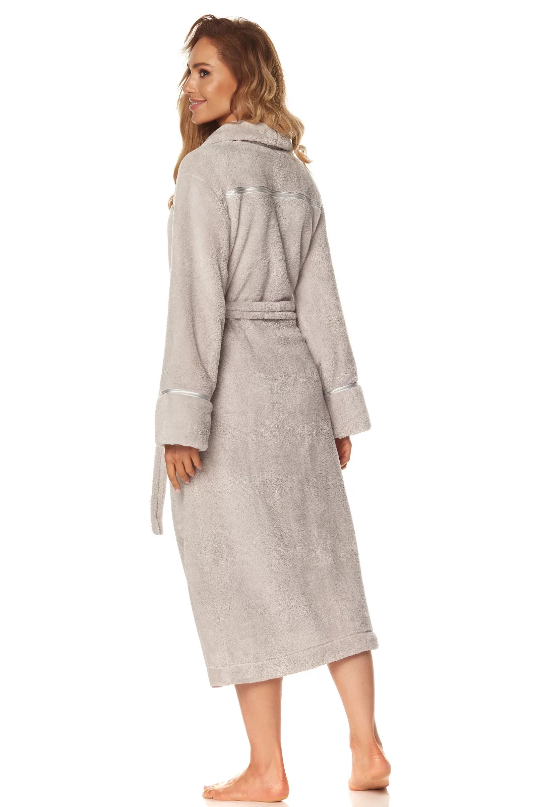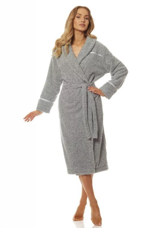 Župan má šálový golier. Model je ozdobený saténovým prešitím. Župan má na bokoch vrecká av páse sa zaväzuje.
