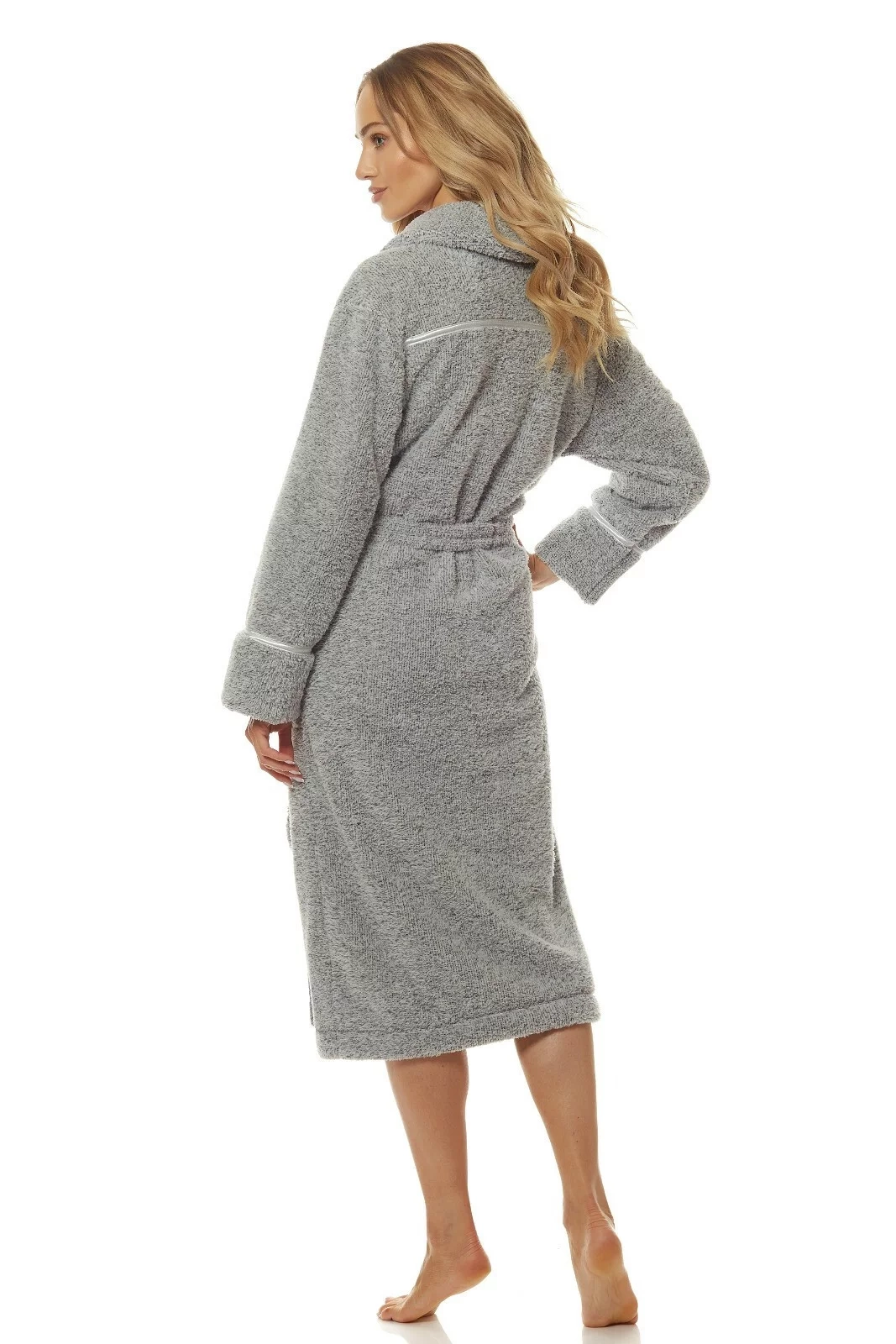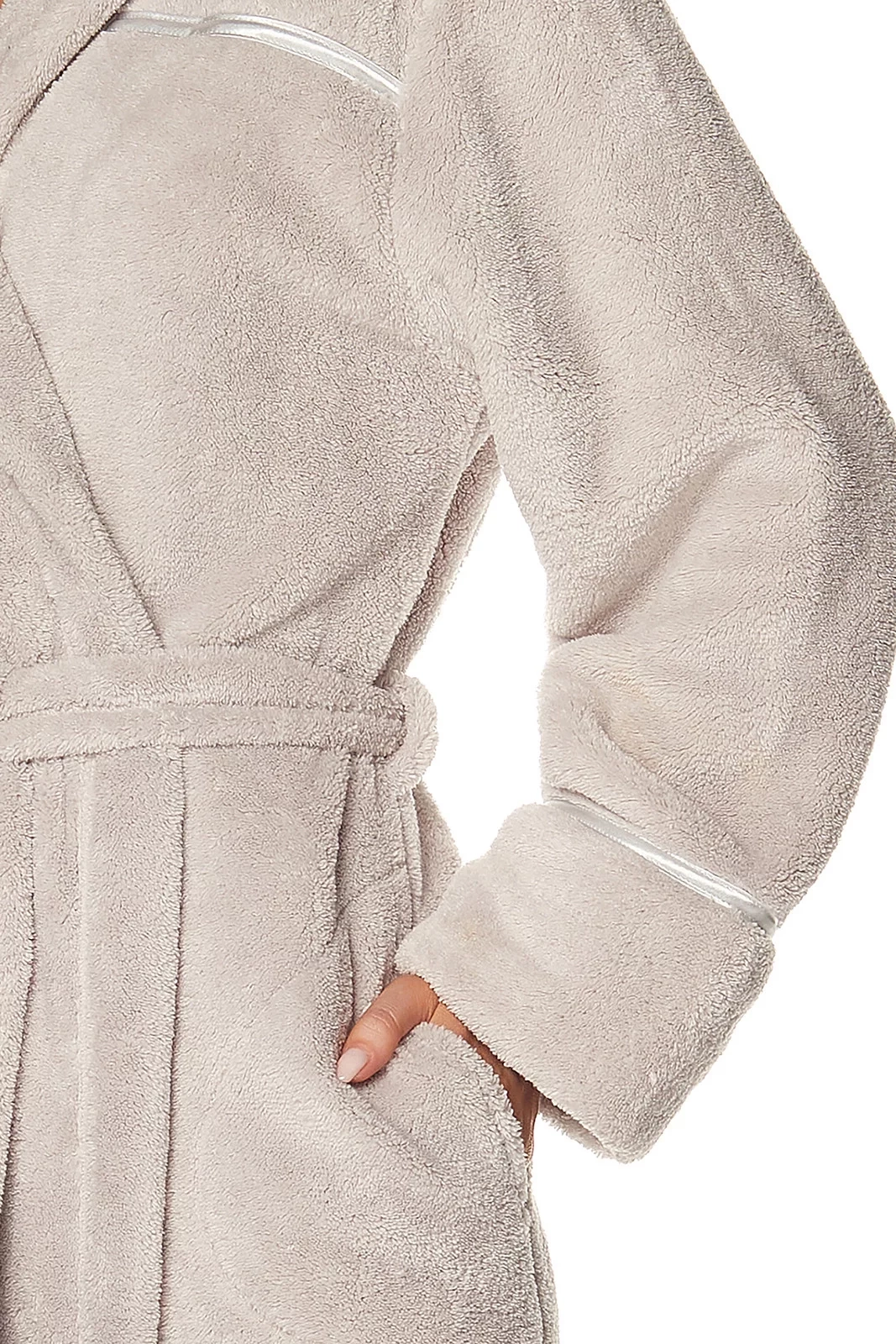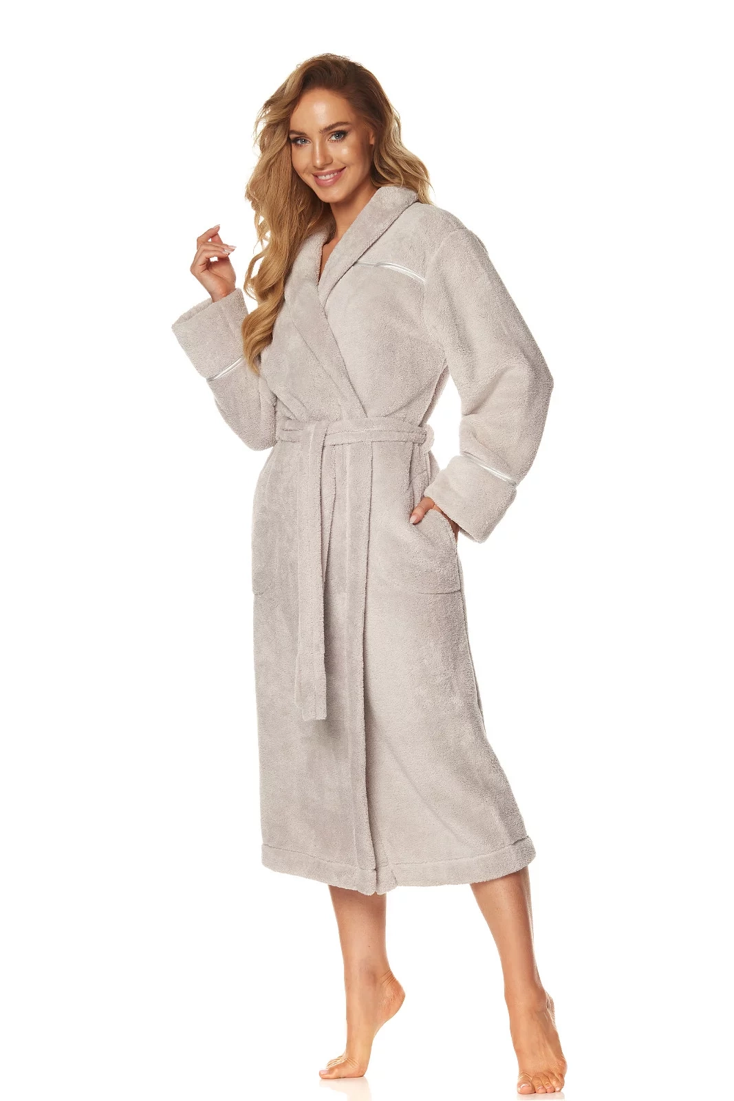 Župan má šálový golier. Model je ozdobený saténovým prešitím. Župan má na bokoch vrecká av páse sa zaväzuje.